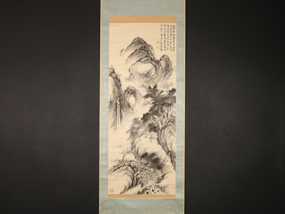 【模写】【伝来】am5403〈田能村直入〉雲峰飛瀑図 服部五老極箱 絖本 田能村竹田師事 大分の人 大阪で活躍