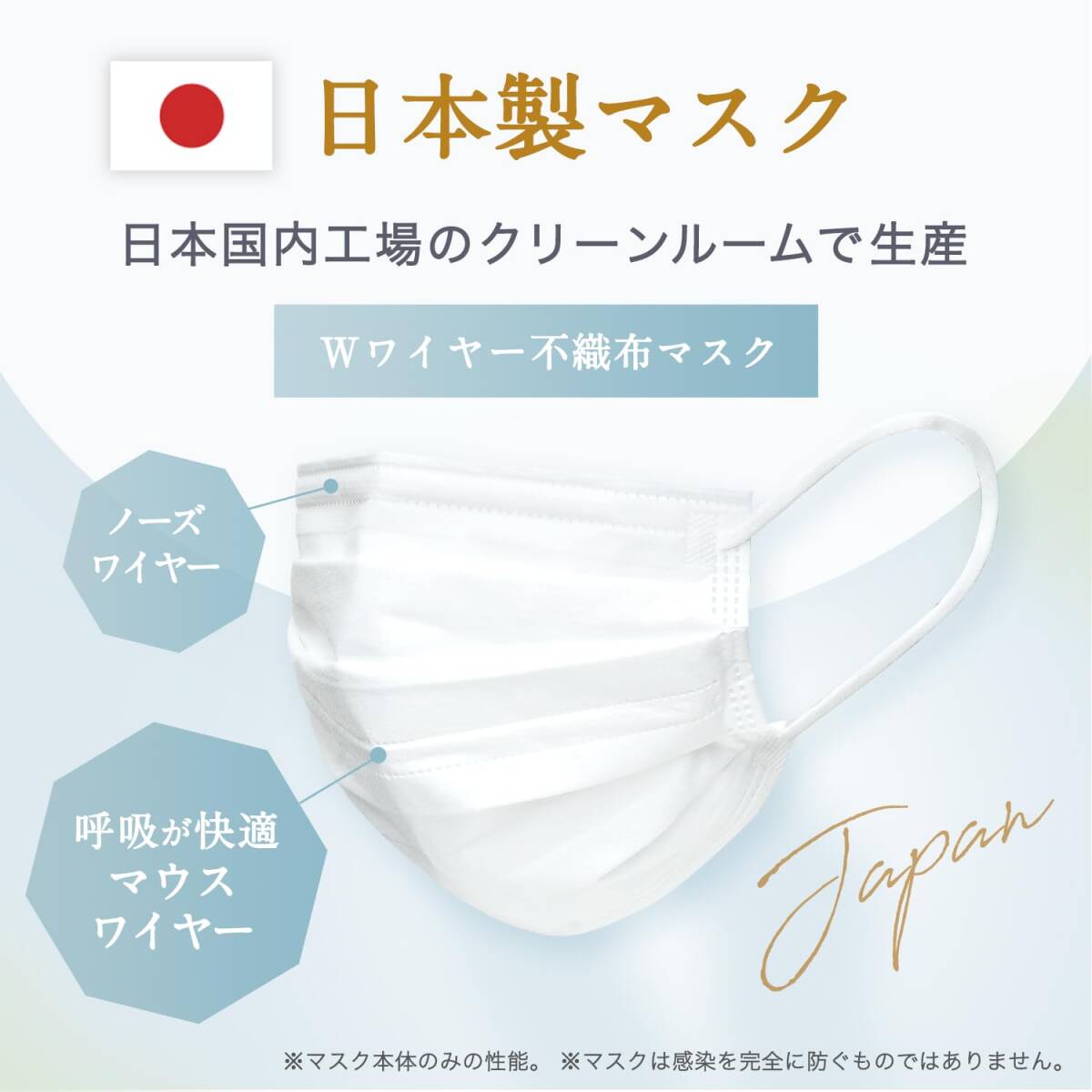 ●国産の不織布マスク。日本国内工場のクリーンルームで生産しています。●高機能フィルタ採用。3層構造で花粉・ウイルス飛沫・PM2.5などをガードします。●マウスワイヤーで口元の「はりつき」を軽減し、快適に呼吸ができるダブルワイヤーです。●痛くなりにくい柔らか耳ひもです。
