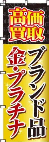 「高価買取ブランド品・金・プラチナ」のぼり旗です。高さ1800mm × 幅600mm、最も一般的なサイズです。のぼり旗の端を縫製することで耐久性を上げる、「ほつれ防止加工」を施しています。使用環境にもよりますが、3ヶ月~1年ほどが耐久目安です。集客、店舗装飾、商品・サービス訴求にご利用ください。のぼり旗の特徴生地はテトロンポンジと呼ばれるポリエステル100%の素材で、今日ではのぼり旗に使われている最も主流な生地です。厚みは約0.14mm、裏抜け(透過性)が良く、裏から見ても絵柄がハッキリと見て取れます。印刷には高機能のインクジェットプリンターを採用し、発色が良く、シルクスクリーン印刷では表現がし難かった写真やグラデーションを鮮明に印刷することができます。シルクスクリーン印刷に対して、ダイレクト昇華印刷とも呼ばれます。低価格の理由のぼりキングでは徹底した品質管理と製作工程の効率化、安定した生産量の保持、コストの削減により低価格でお客様にご提供することができています。使用上の注意●営業時間外はのぼり旗を仕舞うことで劣化を防ぎ、より長くお使いいただけます。●のぼり旗を公道に設置することは道路交通法で禁止されています。●市区町村によっては景観条例等の理由によりのぼり旗の設置が認められない場合もございます。確認の上ご利用ください。●市区町村によっては役場の許可を得る必要があるので、確認のうえ申請手続きを行なってください。●防炎加工は施しておりません。展示会場や公共施設によっては防炎加工が必要な場合がございます。