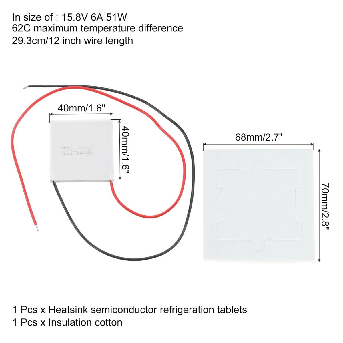 ヒートシンク半導体冷却タブレットは、以下のサイズです:15.8V 6A 51W、最大温度差62℃、40mm x 40mm x 3.6mmのサイズ、29.3cmのワイヤー長さ、68mm x 70mmの断熱綿が付属しています。