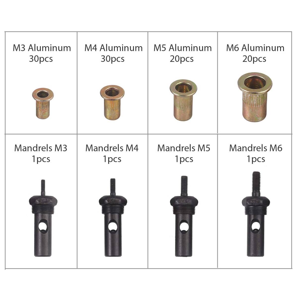 M3/M4/M5/M6/M8リベットナットに適用、セット内容:M3*30pcs、M4*30pcs、M5*20pcs、M6*20pcs。(注意:M5ネジが既に装着されています)