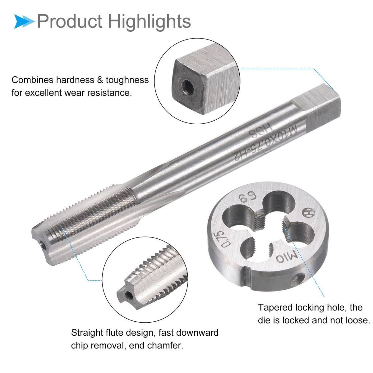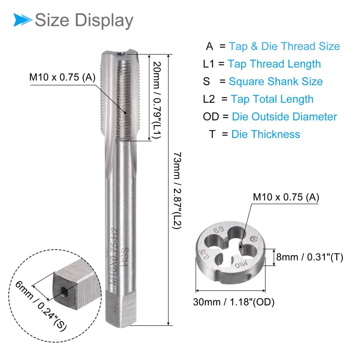 ★ タップとダイセットのサイズ --- タップ & ダイねじサイズ:M10 x 0.75; タッピング方向:右側; タップ精度:H2; スクエアシャンクサイズ:6mm; タップねじ長さ:20mm; タップ全長:73 mm; ダイ外径:30mm; ダイ厚さ:8mm
