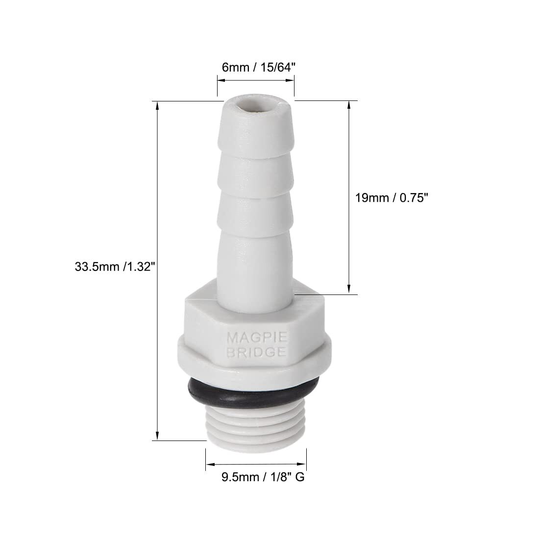 サイズ: 6mm or 6mm バーブ x 10mm G オス ; -30度から100度まで温度範囲。