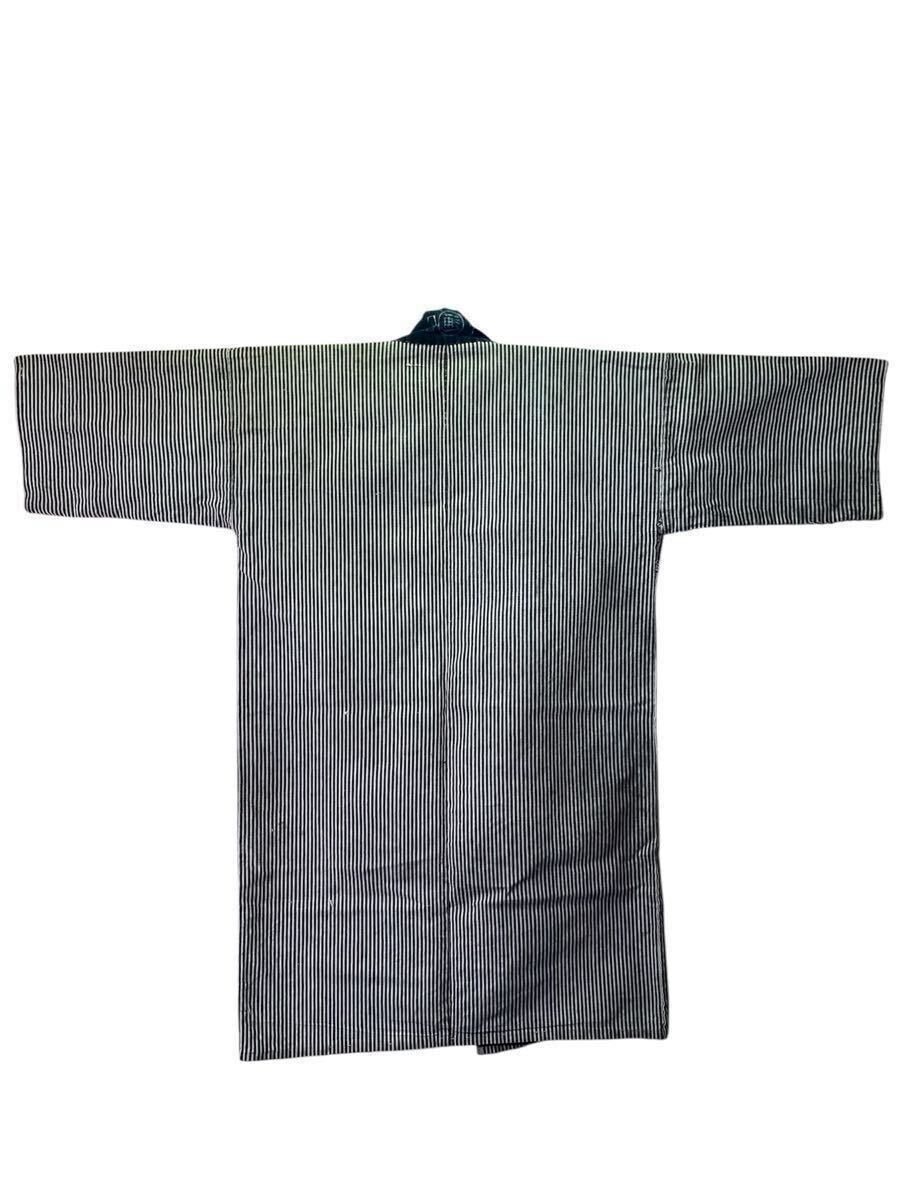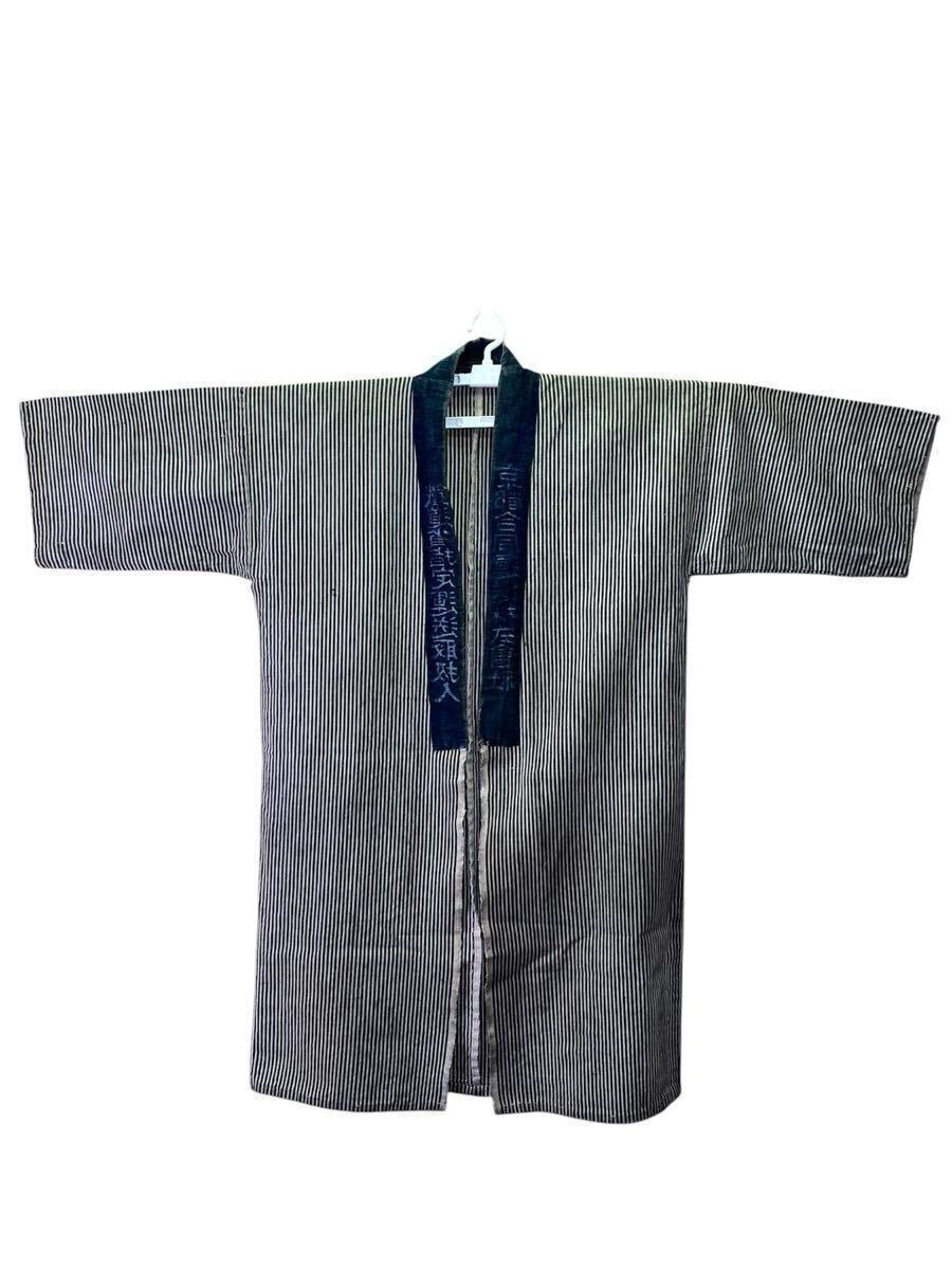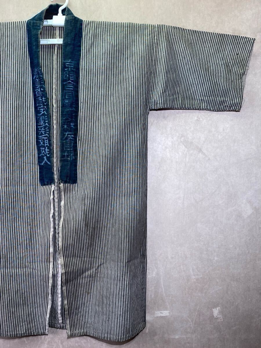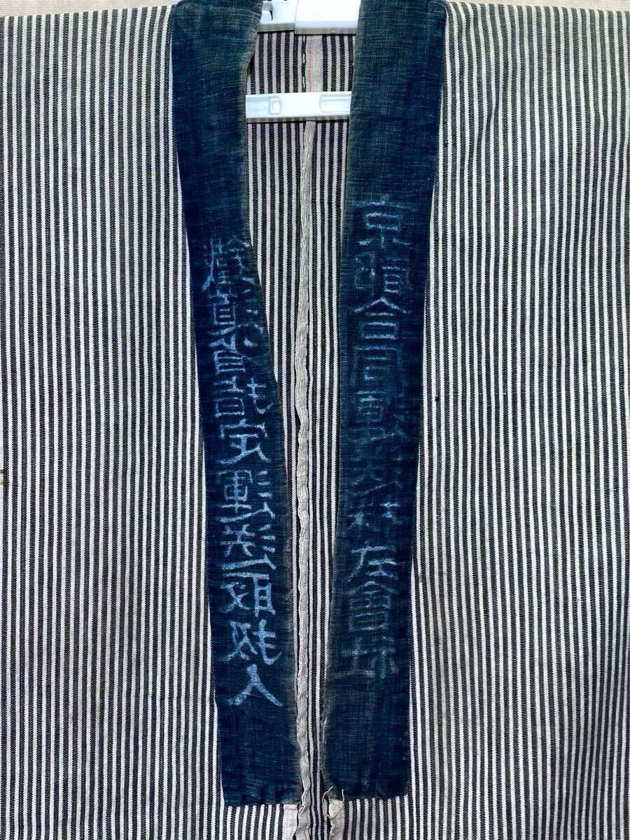 藍染の襟に旧字体で京都合同運送株式會社、鐵道省指定運送取扱人とあります。襟後にはロゴのようなものまで。