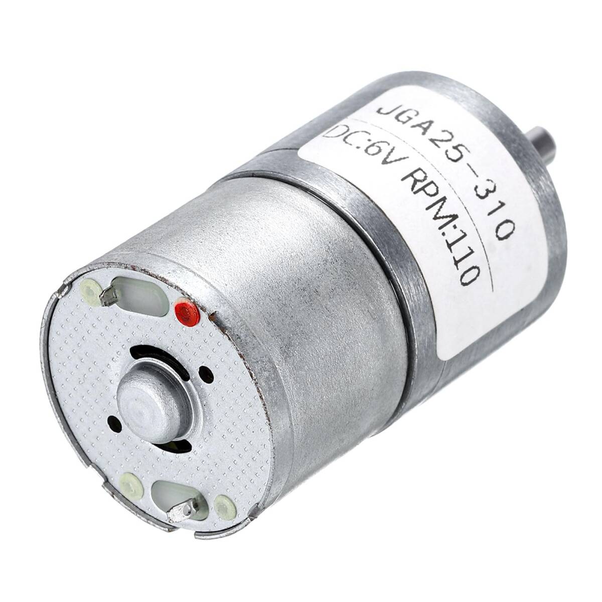 モデル:JGA25-310;カラー:シルバートーン;スピード:110RPM;電圧:6ボルト(DC);モーターサイズ(シャフトを除く):39 x 25mm / 1.54" x 0.98"(L*D);D型出力シャフトサイズ:10 x 4mm / 0.39" x 0.16"(L*D);全長:53 mm / 2.09"。