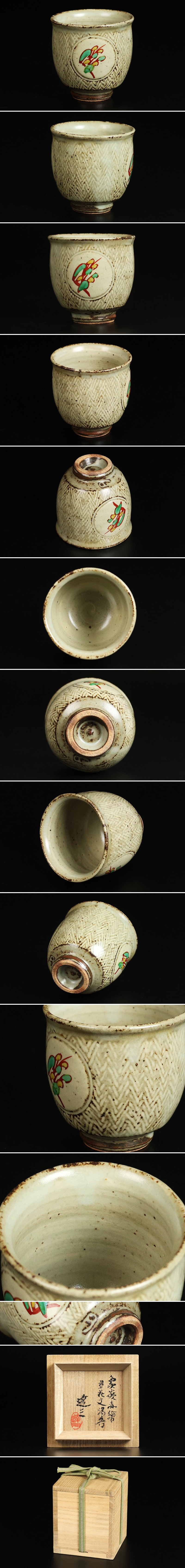 【 島岡達三 】作 象嵌赤絵草花文湯呑 人間国宝 共箱 保証
