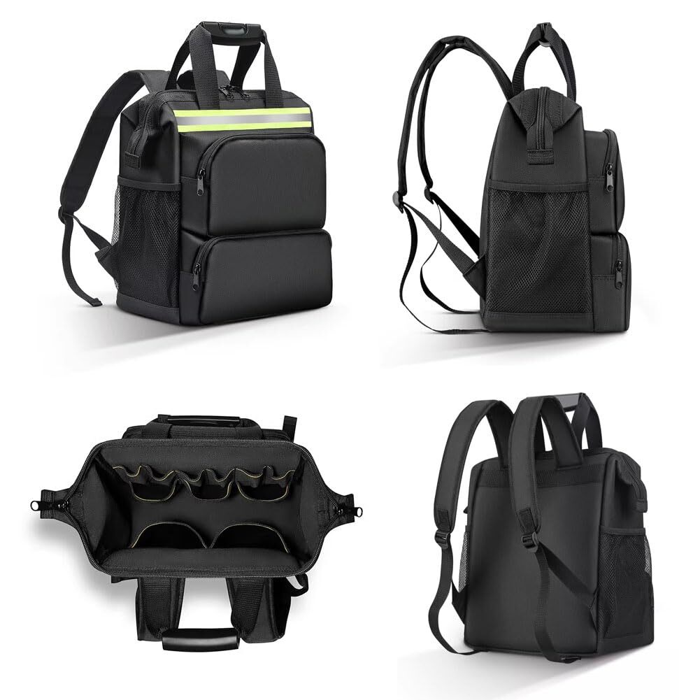 【快適なデザイン】人間工学に基づいて、工具バックパックのバックパネルやショルダーストラップは幅を広め、柔らかなパッドが付いて、優れた減圧効果があり、長時間に重い工具を負担しても疲れにくいです。また、通気性が高い、汗などを速やかに吸収できます。暑い日でも快適に背負います。