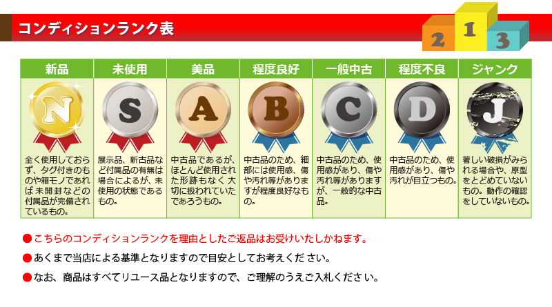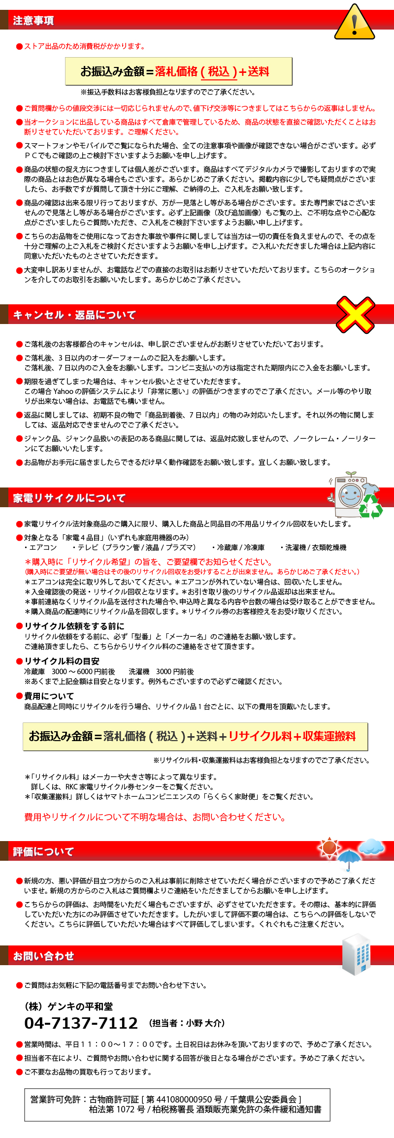 ◇領収書の発行が可能となっております。商品発送完了後、当店より「取引ナビ」にメッセージを送信いたします。メッセージ内のリンクより必要に応じ、明細付き領収書をダウンロードしてください。 (※コンビ二決済の場合はコンビニからお受け取りの領収書・受領書が、正式に領収書となります。) ◇実店舗での販売と併売させて頂いている商品もございます。その場合ご入札頂いたタイミングによっては、稀に売り切れにより、在庫切れになってしまう場合がございます。ご了承ください。 ◇商品画像は明るさを調整しております。 パソコン上で表示される色は各モニターの性能や設定により異なり、実物と画像の色合いが多少違って見える場合がございます。 ◇商品の確認は出来る限り行っておりますが、汚れやダメージの見落としがある場合がございます。必ず商品画像もご覧のうえ、ご不明な点やご心配な点がございましたら、ご質問いただけますようお願い申し上げます。 ◇当店で取り扱っている商品はすべて買取品となっております。新品をご希望の方は、誠に恐れ入りますが、ご入札をご遠慮くださいますようお願い申し上げます。 | |