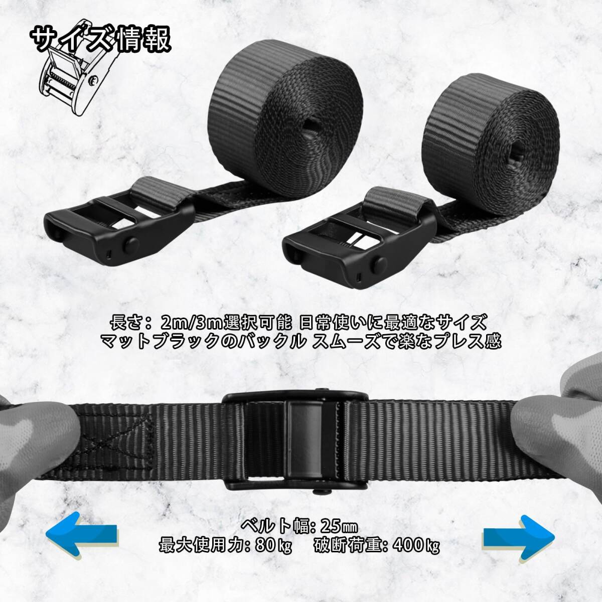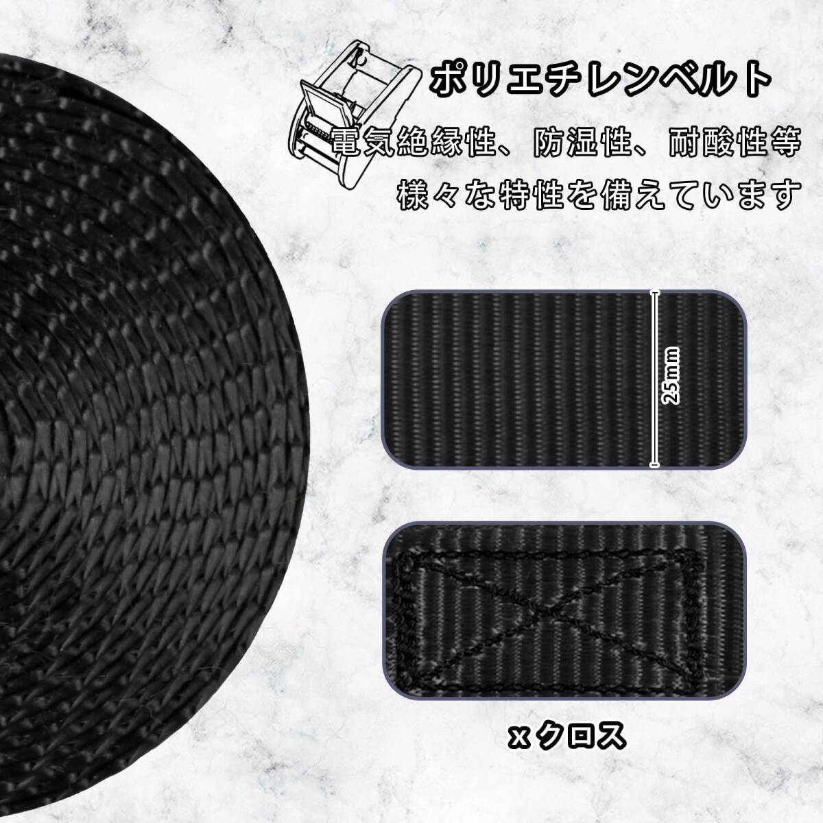 【内容物とサイズ】荷締めバンド4本 ベルトの長さ:3m 幅:25mm 厚さ:1.3mm 1本の重量:約100g(金具含む)