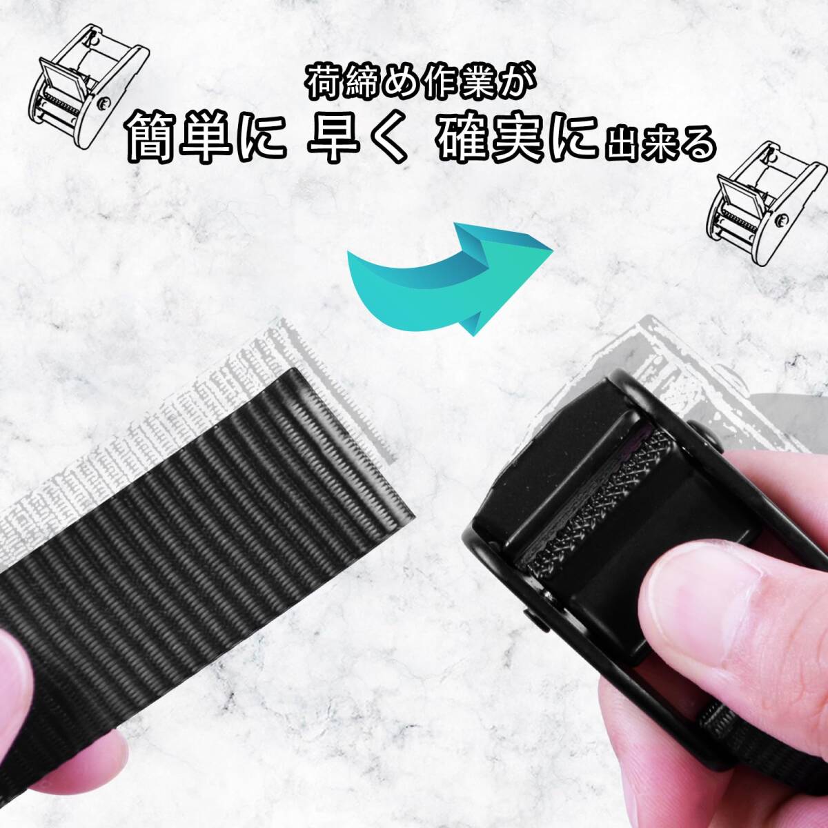 【家庭や個人用】車のルーフキャリア用、オートバイ荷台に物を固定、キャンプ・引っ越しの際、スーツケースの固定や洗濯機などを運ぶ・ラッシング・家具締付固定など、自動車だけではなくバイクや台車などでもご使用いただけます。ハンモックを木に固定する際にもお使いいただけます。