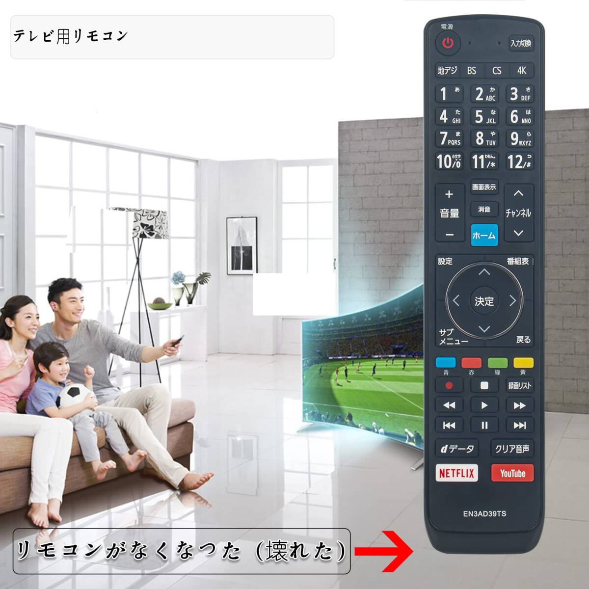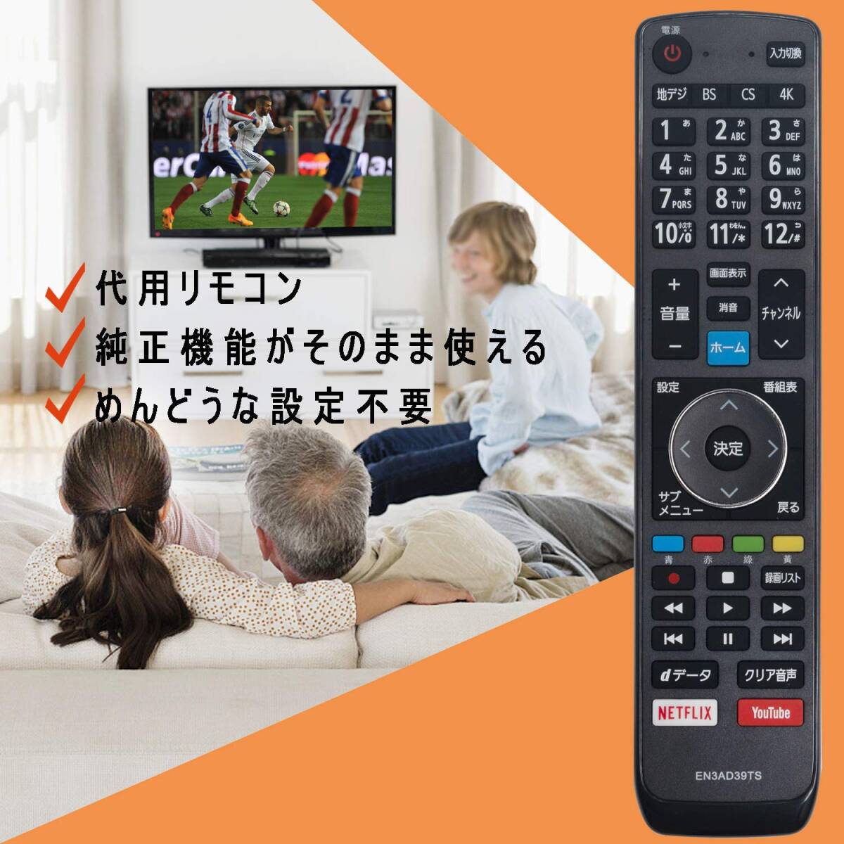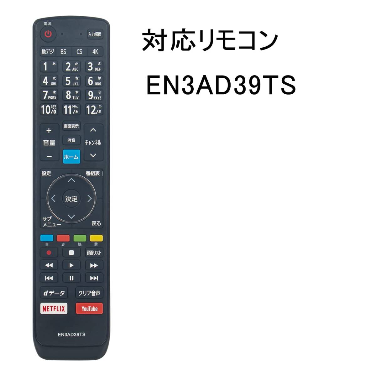 ?「代用リモコン」です。?純正リモコンに付いているのボタンが設置 されており、機能は全て使用できます。※ご注意:?このリモコンは「EN3AD39TSJ」の代用リモコンとして使用できます。 このリモコンは汎用リモコンではなく、他の型番の代用リモコンとして使用できないでございます。ご了承の上、ご購入ください。?このリモコンで操作する前に、アルカリ乾電池(新品)をご利用ください。?アフタサービス:ご購入した商品についてご不明点などございましたら、メールでご連絡下さい。弊店はカスタマーに対し、最高水準のカスタマーサービスを提供することをお約束します。(保証期間(1年)内に製品に故障が生じた場合は、返品若しくは返金の対応ができますのでご安心ください。)