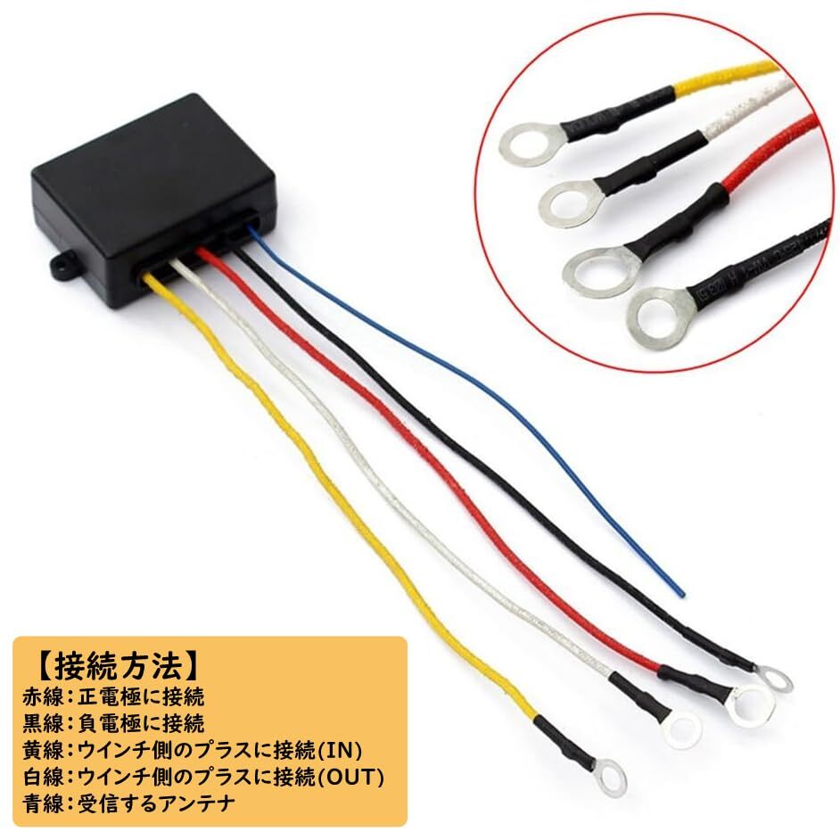 【取り組み簡単】簡単にインストールして使用することができます。赤線(+)は正電極に接続し、黒線(-)は負電極に接続し、黄線(IN)/白線(OUT)はウインチ側のプラスに接続し、青線は受信するアンテです。