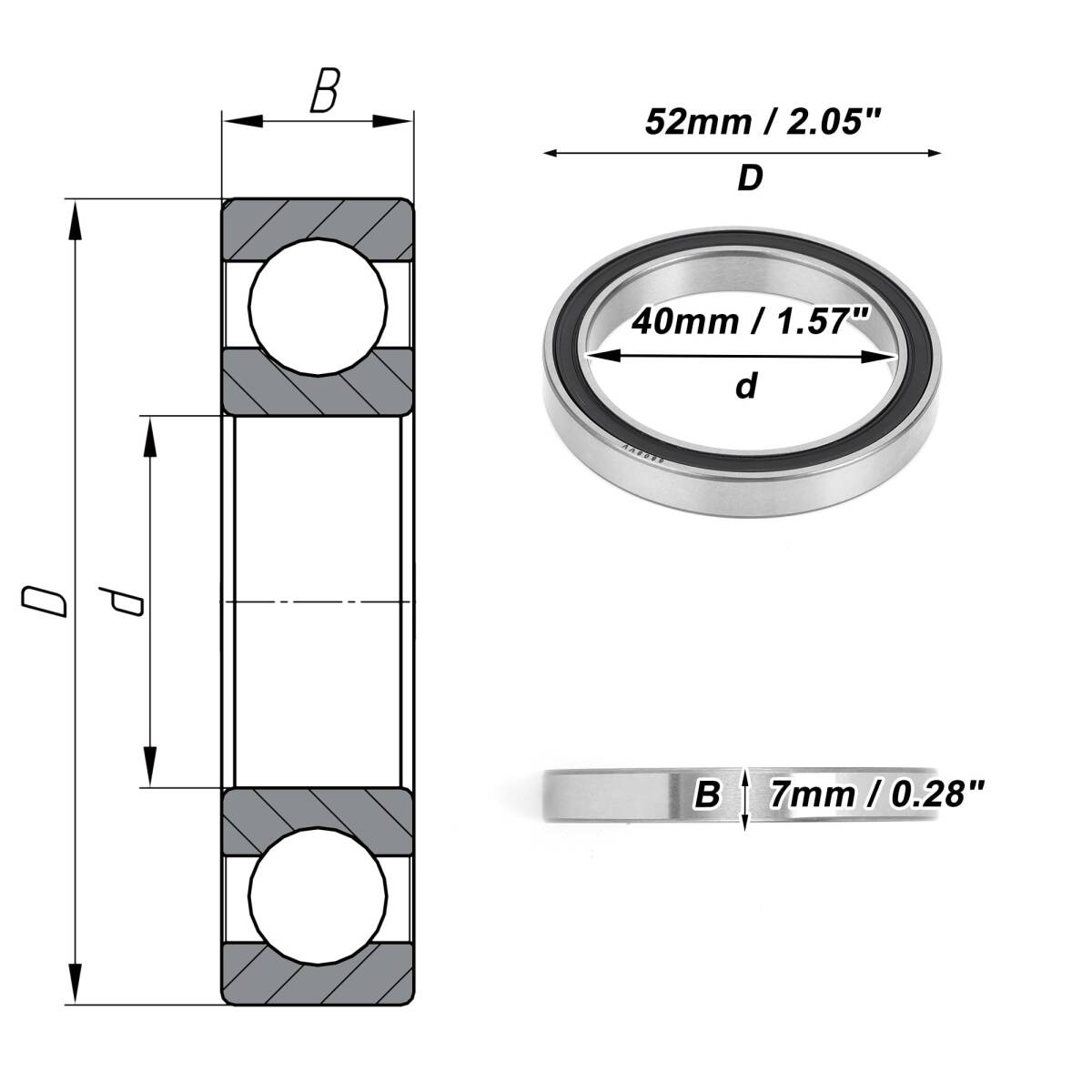 仕様:外径: 52mm / 2.05"、内径: 40mm / 1.57"、幅: 7mm / 0.28"、タイプ: 6808VV、精度レベル: P6、基本荷重評価 (kN): Cr:6.35 C0r:5.55、限界速度(min-1): グリース:12000