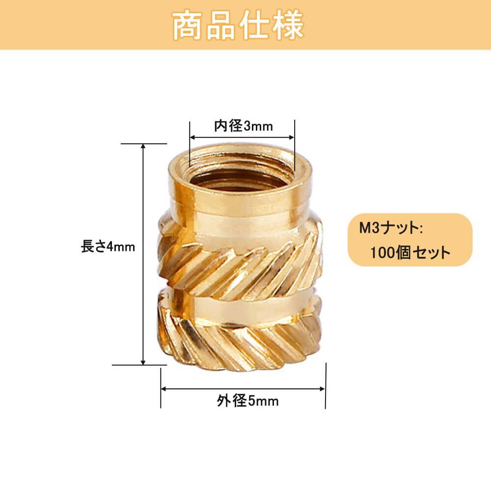 製品名: ねじ込みインサートプレミアム素材:真鍮サイズ:長さ4mm、外径5mm、内径3mm、間隔0.5mmパッケージ内容: 100個セット 製品重量:約40g製品の特徴:1. 真鍮ねじインサートは耐食性と熱伝導性に優れており、長期安定した使用に適しています。2. サイドのローレット加工が複雑で、熱圧入後はかなり強固に固定されます。3. ローレットナットは使いやすいです。 3Dプリンターのテーパー穴に熱で簡単に取り付けたり、射出成形も可能です。注意事項:商品は手作業で計測しておりますので、サイズに誤差が生じる場合がございます。実際の商品をご参照ください。