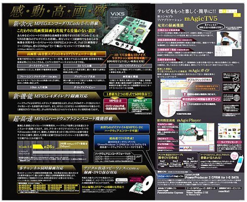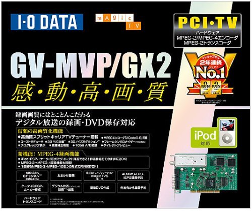 Amazonより録画画質にはとことんこだわる。iPod対応形式で直接録画できる圧倒的な高画質を実現するMPEG-2/4エンコーダ「XCode II-E」を搭載したPCI接続の内蔵モデル。独自のアルゴリズムやスプリットキャリアチューナーを搭載し、最高峰のTVキャプチャを実現する。新たにMPEG-4ダイレクト録画に対応し、iPod、PSP、ケータイ向けムービーを直接作成することができるようになった。また、MPEGハードウェアトランスコード機能や、デジタル放送コピーワンス(CGMS-A)番組の録画&DVD保存など、TVキャプチャを楽しみつくすための機能が満載。もちろん、アイ・オーオリジナルソフト「mAgicTV5」が標準添付。パソコンならではの使い心地と、最大6チャンネル(6チューナー)の同時録画※を実現する。※チャンネル数に応じて同時録画対応製品を用意する必要がある。新機能。MPEG-4ダイレクト録画対応iPod、PSPやケータイ向けのムービーを直接作成可能。さらに、1番組をDVD-Video用(MPEG-2)とiPodやPSP用(MPEG-4)の2つのファイルを同時保存可能。超高速。ハードウェアトランスコード機能搭載超高速。約6倍速でのMPEG-2トランスコードを実現。 録画番組をぴったりDVD1枚に収める。 「スマートフィット機能」に対応。 録画番組を指定容量への高速変換機能。商品紹介圧倒的な高画質を実現するMPEG-2エンコーダ「XCode II-E」を搭載したPCI接続の内蔵モデル。独自のアルゴリズムやスプリットキャリアチューナーを搭載し、最高峰のTVキャプチャを実現します。