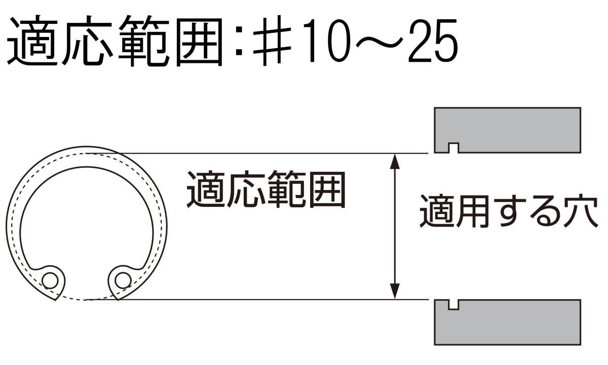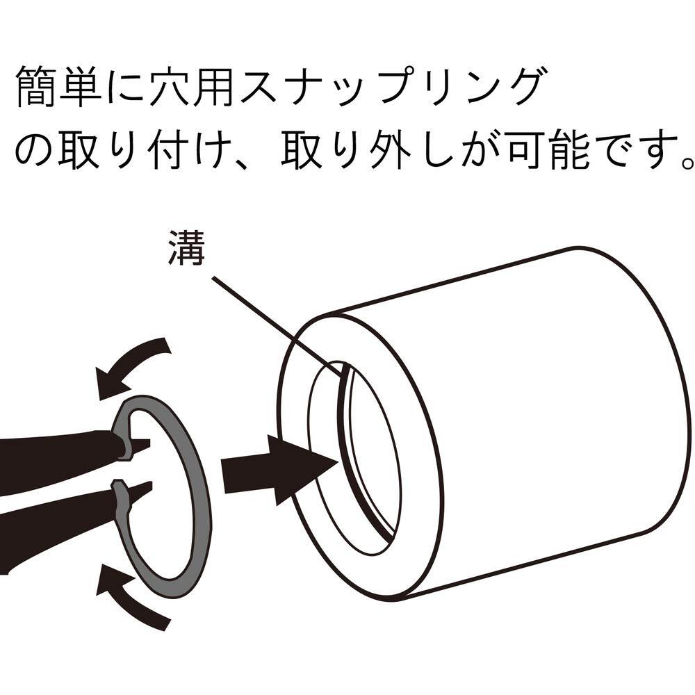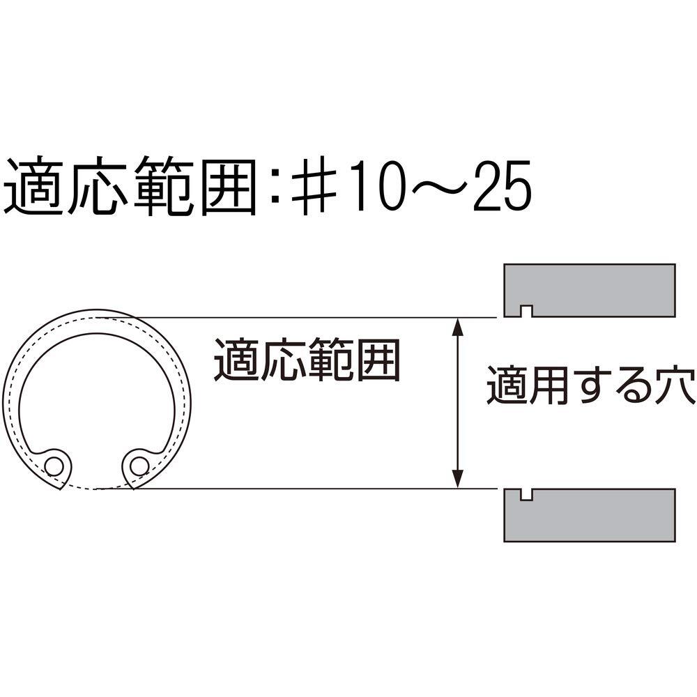 穴用スナップリングプライヤーシンプルかつスマートに狭い所に入り込む簡単にスナップリングの取り付け、取り外しができます。スリムな形状により狭い場所での作業も可能です。特殊機構により滑らかな可動を実現。適応範囲:♯10~25(C形)・♯21~38(丸形)・♯26(ベベル形)先端径:φ1.1o重量:90g材質:高炭素鋼