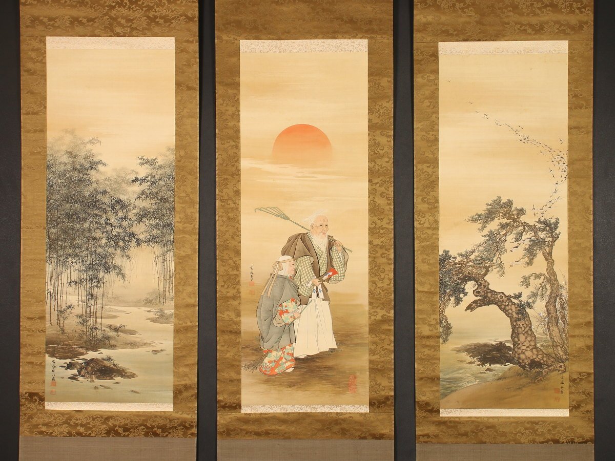 【模写】【伝来】am5465〈邨松雲外〉三幅対 高砂図 共箱 森寛斎師事 滋賀の人