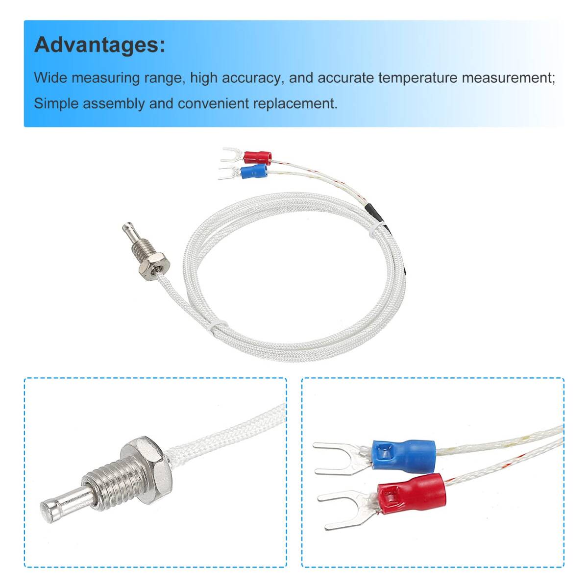 これは何ですか?熱電対は温度を測定するために使用でき、温度測定機器の温度センサーとして広く使用されています。主に科学の使用、産業用使用、エンジンの温度測定に使用され、家庭でも使用されます。何が得られますか?温度センサーは、次のサイズ: M8 ネジ、 1 Mのケーブル長さ、 0-400°C測定温度パッケージの内容:2個 x 温度センサー製品の利点はありますか?幅広い測定範囲、高精度、および正確な温度測定。シンプルなアセンブリと便利な交換用品です。それの使い方は何ですか?インストールの手順:測定誤差を減らすために、熱電対は十分な挿入深さを持つ必要があります。熱電対測定には追加の電源は必要ありません。これは非常に便利です。何に気づくべきですか?測定する温度範囲は、熱電対を選択するときに考慮する必要があります。