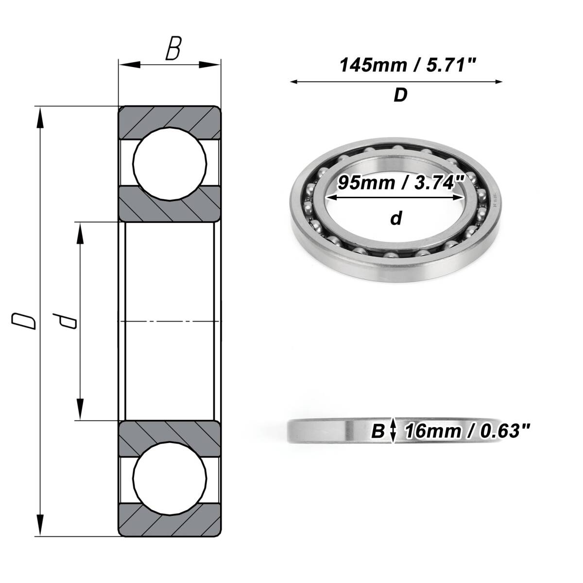 仕様:外径: 145mm / 5.71"、内径: 95mm / 3.74"、幅: 16mm / 0.63"、タイプ: 16019、精度レベル: P6、基本荷重評価 (kN): Cr:43 C0r:42、限界速度(min-1): グリース:4500 オイル:5300