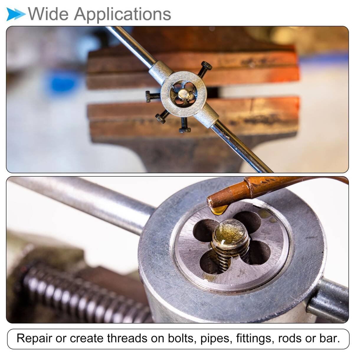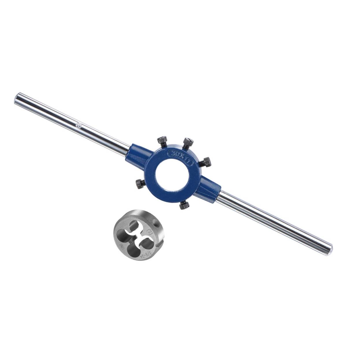 ★ダイとストックセットのサイズ---丸ダイ:ねじサイ:3/8-24UNF。外径:30 mm、厚:11 mm。ダイストッ:サイ:30 mm x 11 mm。適合ダイサイ:20 mm-30 mm外径/M9-M11;全:255 mm、ハンドル直:9.6 mm。