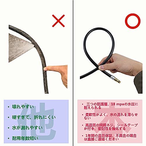 【優れた材料:プレミアムケルヒャーホース】ケルヒャーホースは伸ばしたり巻いたりすることができます。外層は高品質の塩ビ素材、内層は硬度・耐久性に優れた耐摩耗性に優れたPUパイプで、最高40mpaに耐えるケルヒャー高圧ホースです。また接合部は真ちゅう製で錆びにくく耐久性に優れています。