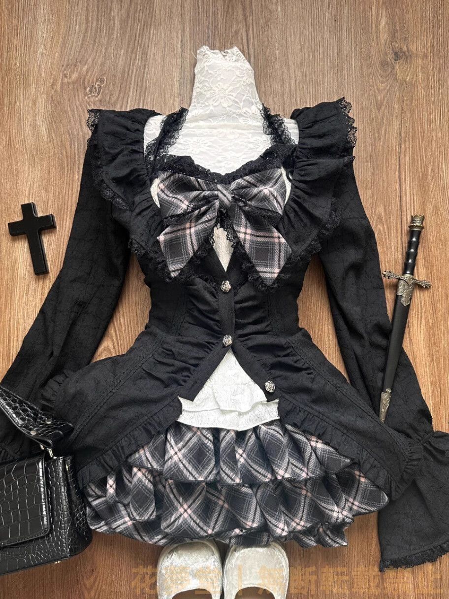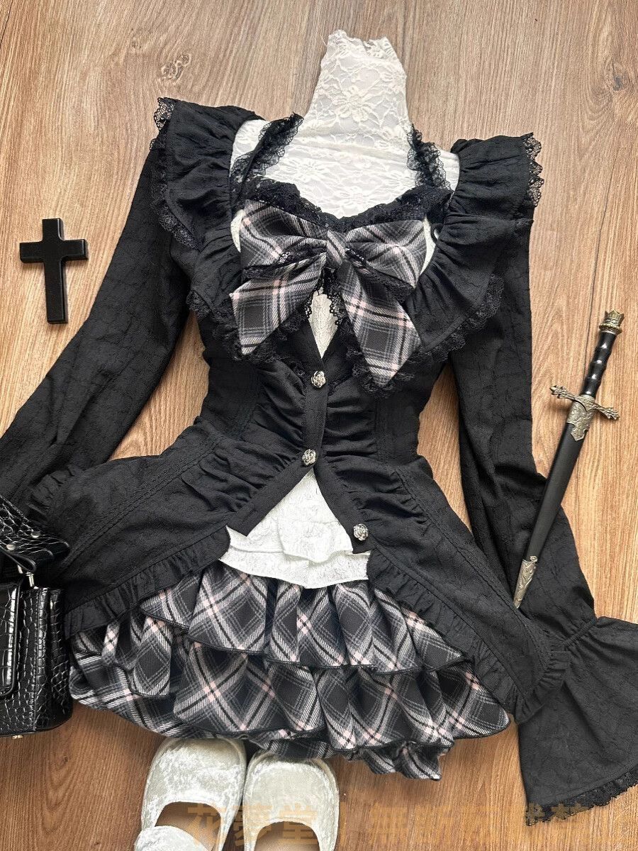 《商品名称》ギャル系 量産型★地雷系 「フレアスリーブシャツ+ロイヤルスタイルのベスト+黒ピンクチェックスカートの3点セット」 NAIMI8