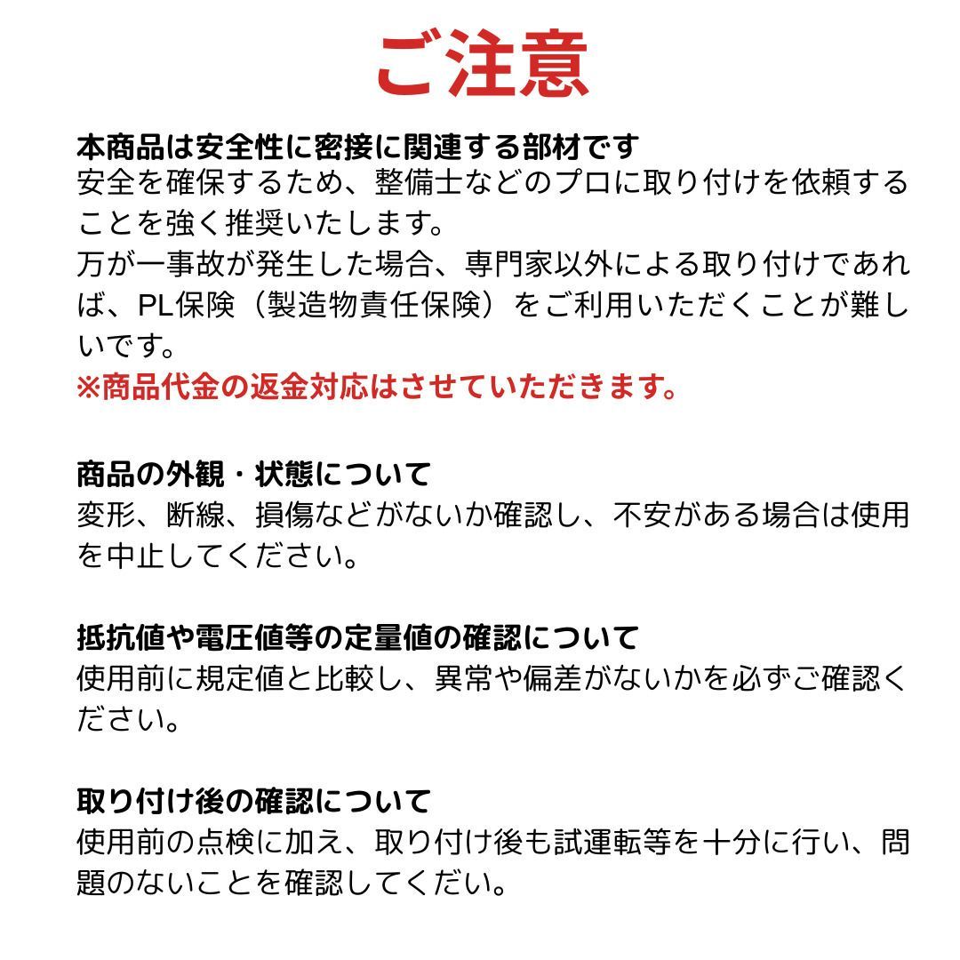 【ご注意】 ■本商品は安全性に密接に関連する部材です。 安全を確保するため、整備士などのプロに取り付けを依頼することを強く推奨いたします。 万が一事故が発生した場合、専門家以外による取り付けであれば、PL保険(製造物責任保険)をご利用いただくことが難しいです。 ※商品代金の返金の対応はさせていただきます。 ■商品の外観・状態について 変形、断線、損傷などがないか確認し、不安がある場合は使用を中止してください。 ■抵抗値や電圧値等の定量値の確認について 使用前に規定値と比較し、異常や偏差がないかを必ずご確認ください。 ■取り付け後の確認について 使用前の点検に加え、取り付け後も試運転等を十分に行い、問題のないことを確認してください。