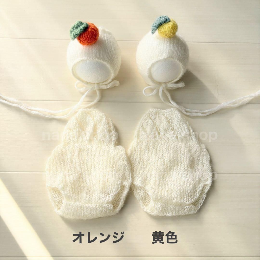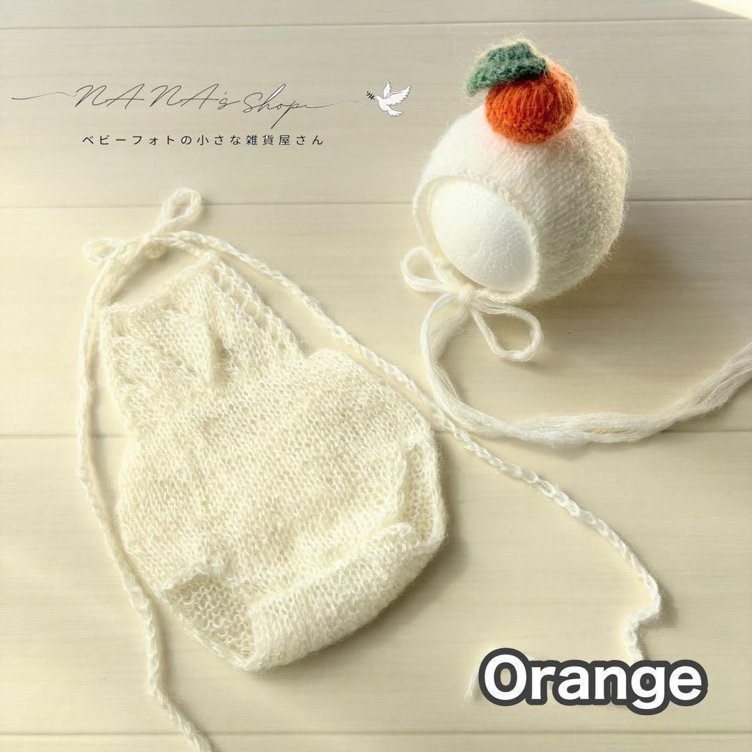 ニューボーンフォトのコスチューム、みかんの乗った、鏡餅ボンネットと編み込みロンパースのセットになります。