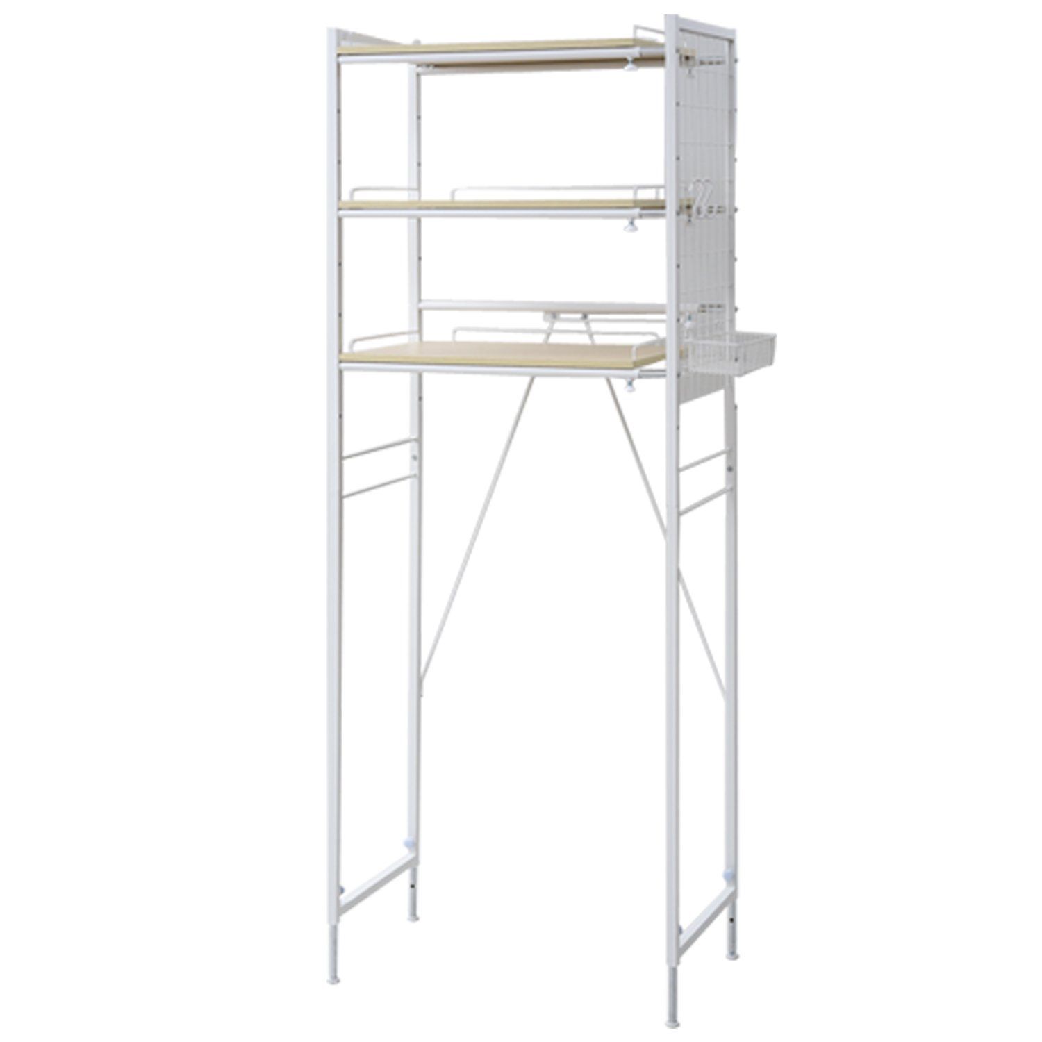 ●棚板は天板除いて2枚で、10cmピッチで調節可能br>●棚板・カゴ・フック・ハンガー部分と多種にわたる収納箇所があり、ごちゃつきがちなランドリー収納を一気にひとまとめ