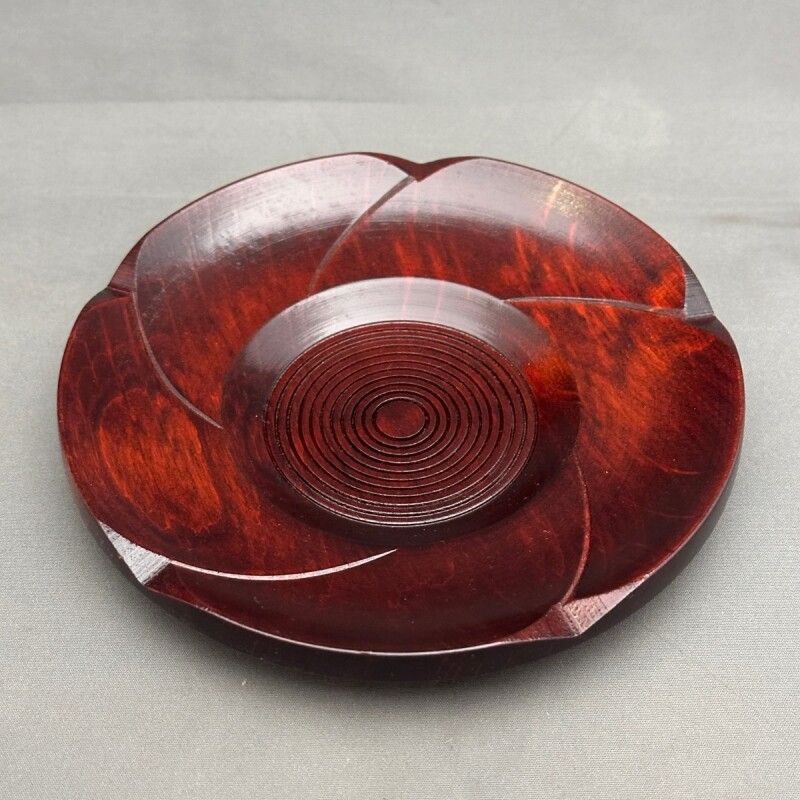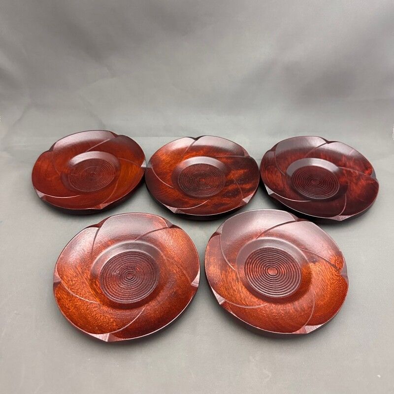 花びらをかたどった優美な輪郭が目を引く、木製の4.0寸茶托5枚組です。