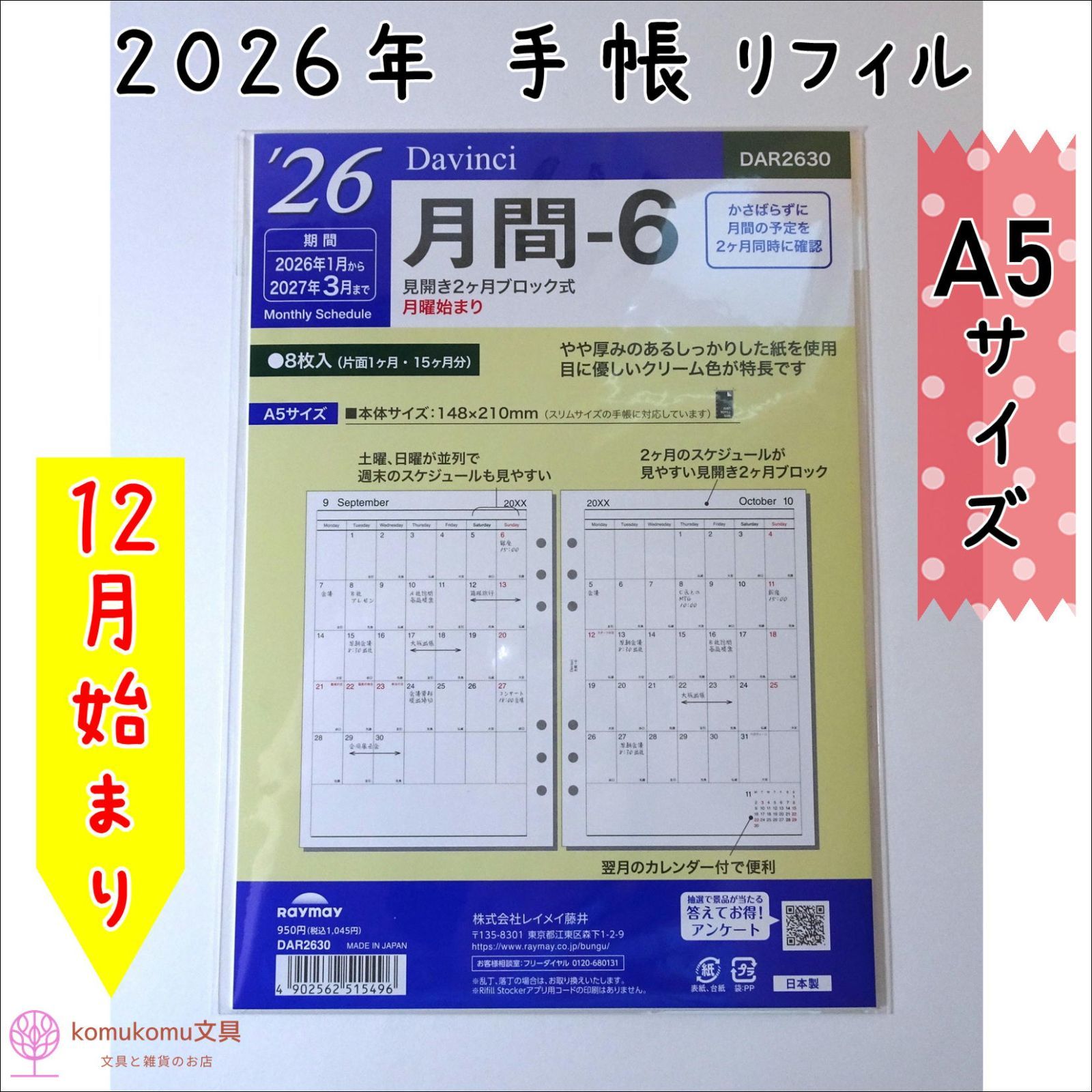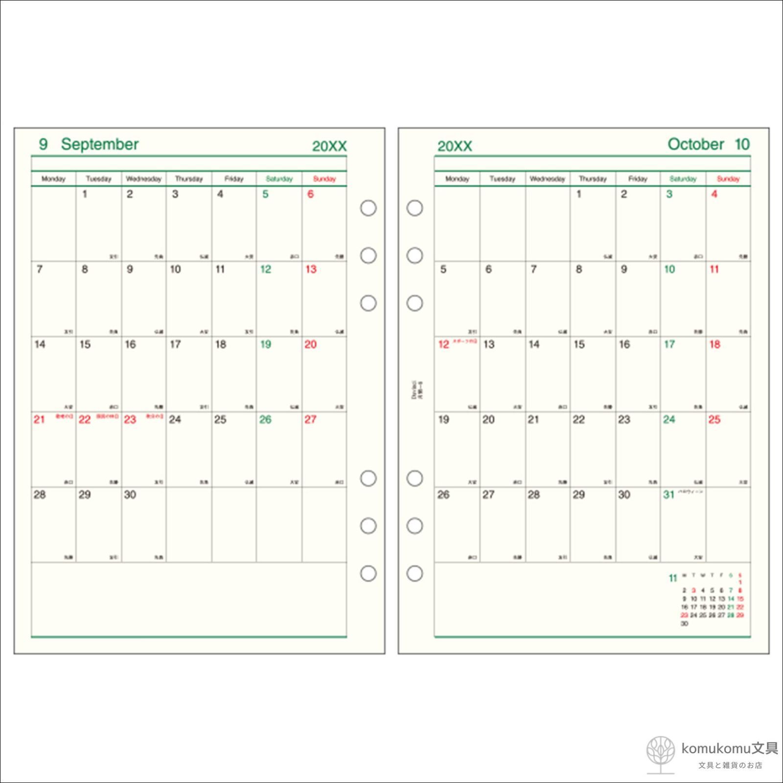 仕様:見開き両面2ヶ月ブロック式・月曜始まり