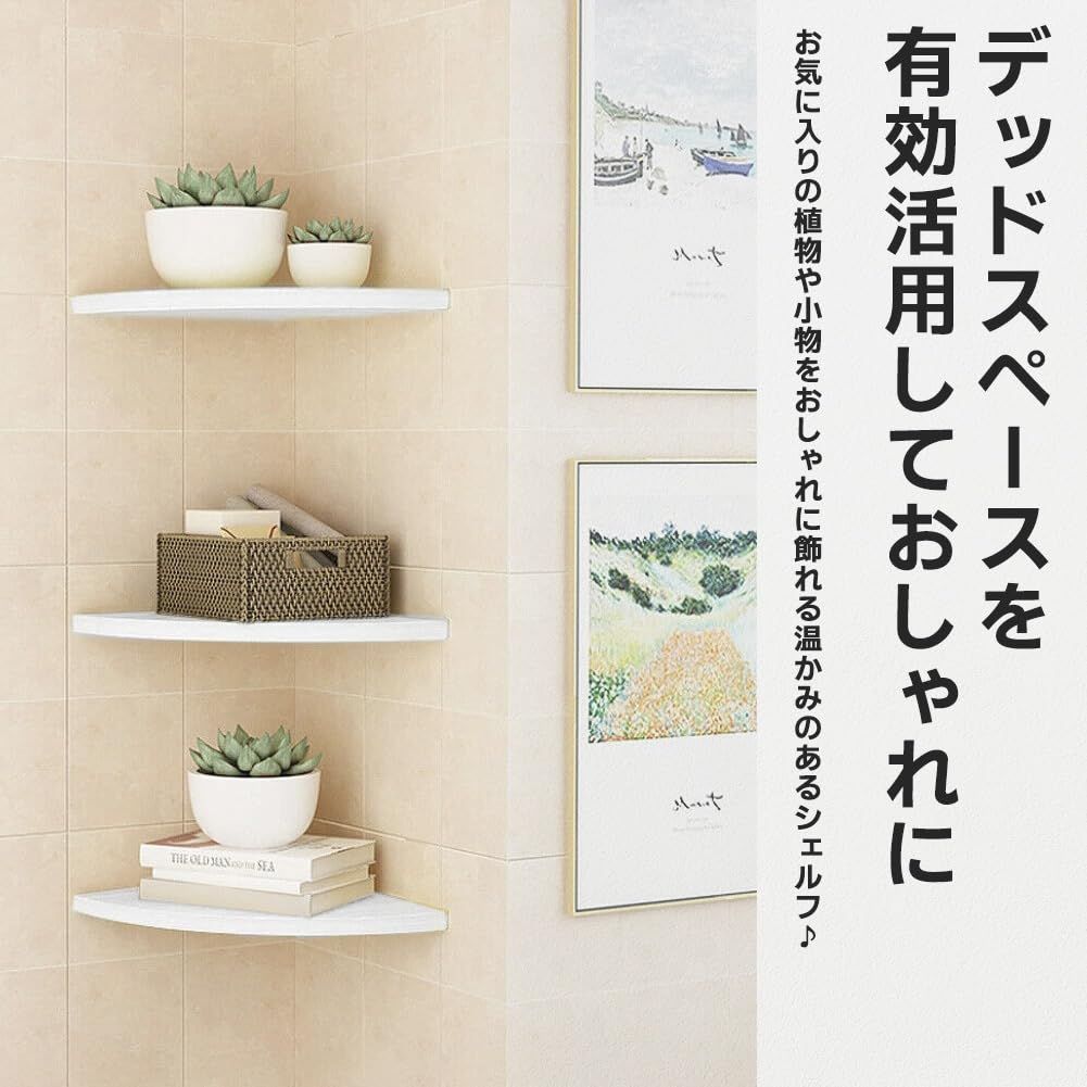 【シンプルなデザイン】90度の角地に取り付けできる飾り棚です。シンプルなデザインが特徴の壁掛け棚はどんなインテリアにも自然にマッチします。整理された空間を演出し、家全体にスタイリッシュな雰囲気を加えます。リビングや、洗面所、お手洗いなどのコーナーにも。場所を取らずに、ちょこっと飾りたい時に便利です。