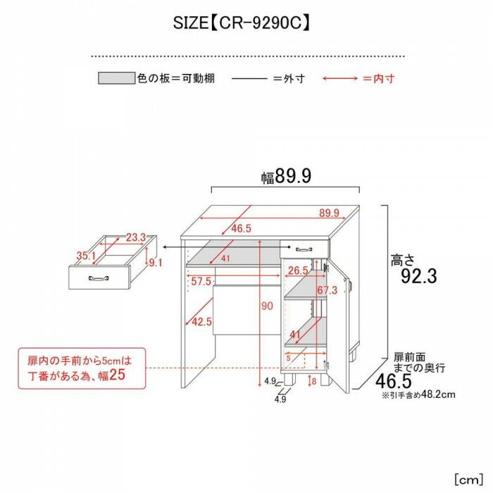 サイズ:外寸:幅89.9×奥行(引手含む)48.2×高さ92.3cm、脚の高さ:8cm