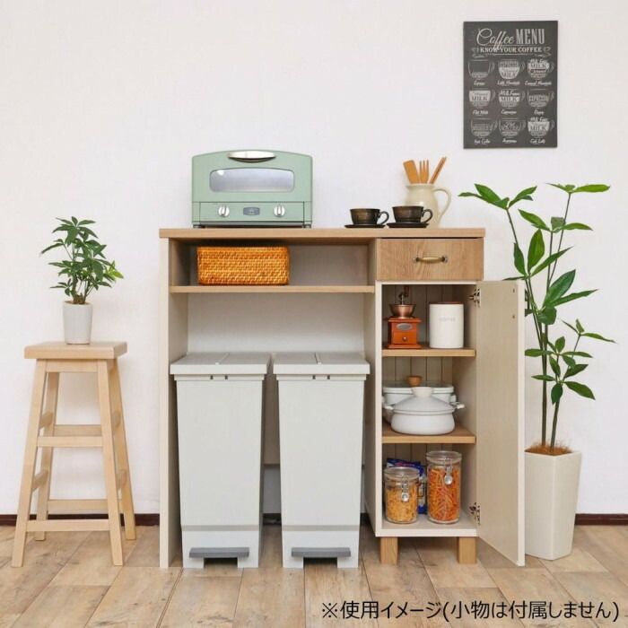 ゴミ箱の上にあるデッドスペースです。もったいない空間を収納スペースに早変わりします。キッチンスペースをより有効活用できるよう使い勝手の良さを考えました。小型家電や食品ストックなどを置いたり、天板も収納スペースとして有効活用できます。作業スペースとしても便利な天板スペースです。キッチンでの作業効率もアップします。