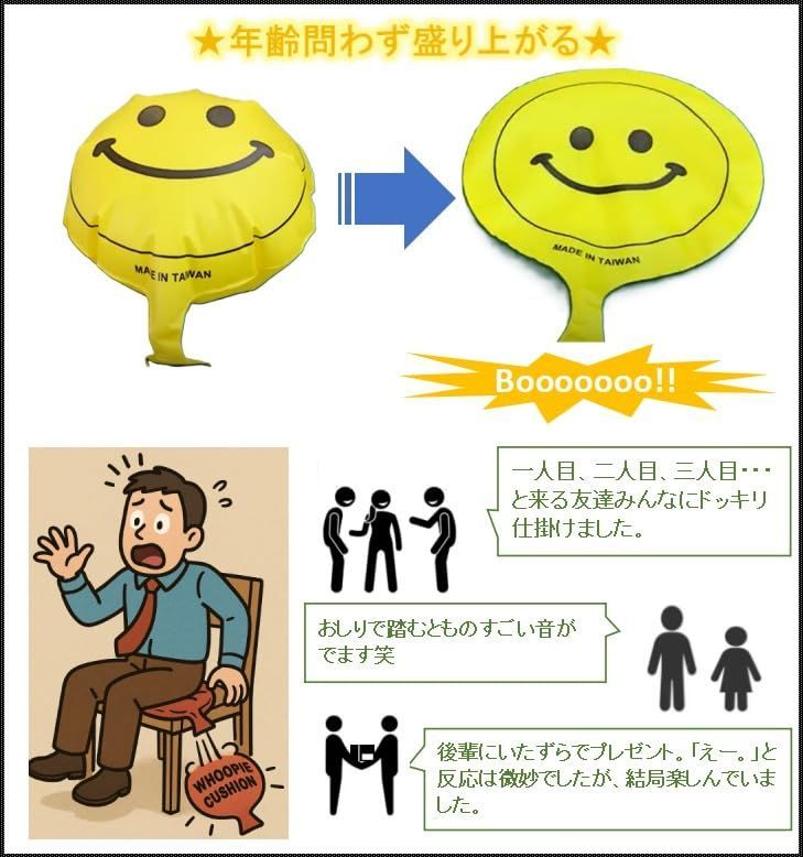多様な用途: シートの上にこっそり隠して、友達が座って大きなおならの音を立てて顔が赤くなるのを眺めてください。家族全員で楽しめます。ブーブークッションは座るだけでおならのような音がなる昔懐かしい一品です♪ブーブークッションは、人々がお尻をひねると大きなおならを作ります。おならやブーブークッション、おならや家族を驚かせましょう。クッションを椅子やソファのクッションの下に隠して、見えないようにします。いたずらの定番アイテム! ブーブークッションです!! 空気を入れて膨らませるタイプなので迫力UP!!対象年齢6歳以上