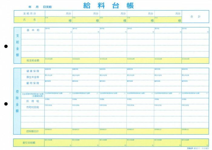 記入欄を広く取り、明細書の項目を簡略化した複写式の給料明細書兼給料台帳です。(タテ型ヨコ書き、5名連記、手当欄4、控除欄3)。
