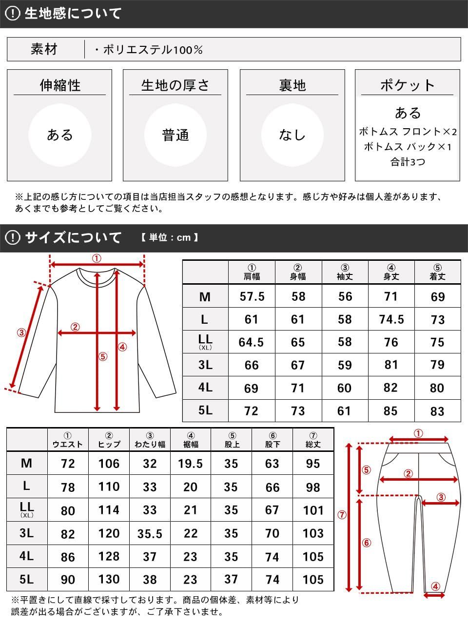 XLサイズ=肩幅64.5cm 身幅65cm 袖丈58cm 身丈76cm 着丈75cm ウエスト80cm ヒップ114cm わたり幅33cm 裾幅21cm 股上35cm 股下67cm 総丈101cm(下札表示対応サイズ)胸囲104~112cm ウエスト94~104cm 3Lサイズ=肩幅66cm 身幅67cm 袖丈59cm 身丈81cm 着丈79cm ウエスト82cm ヒップ120cm わたり幅35.5cm 裾幅22cm 股上35cm 股下70cm 総丈103cm(下札表示対応サイズ)胸囲106~114cm ウエスト96~106cm