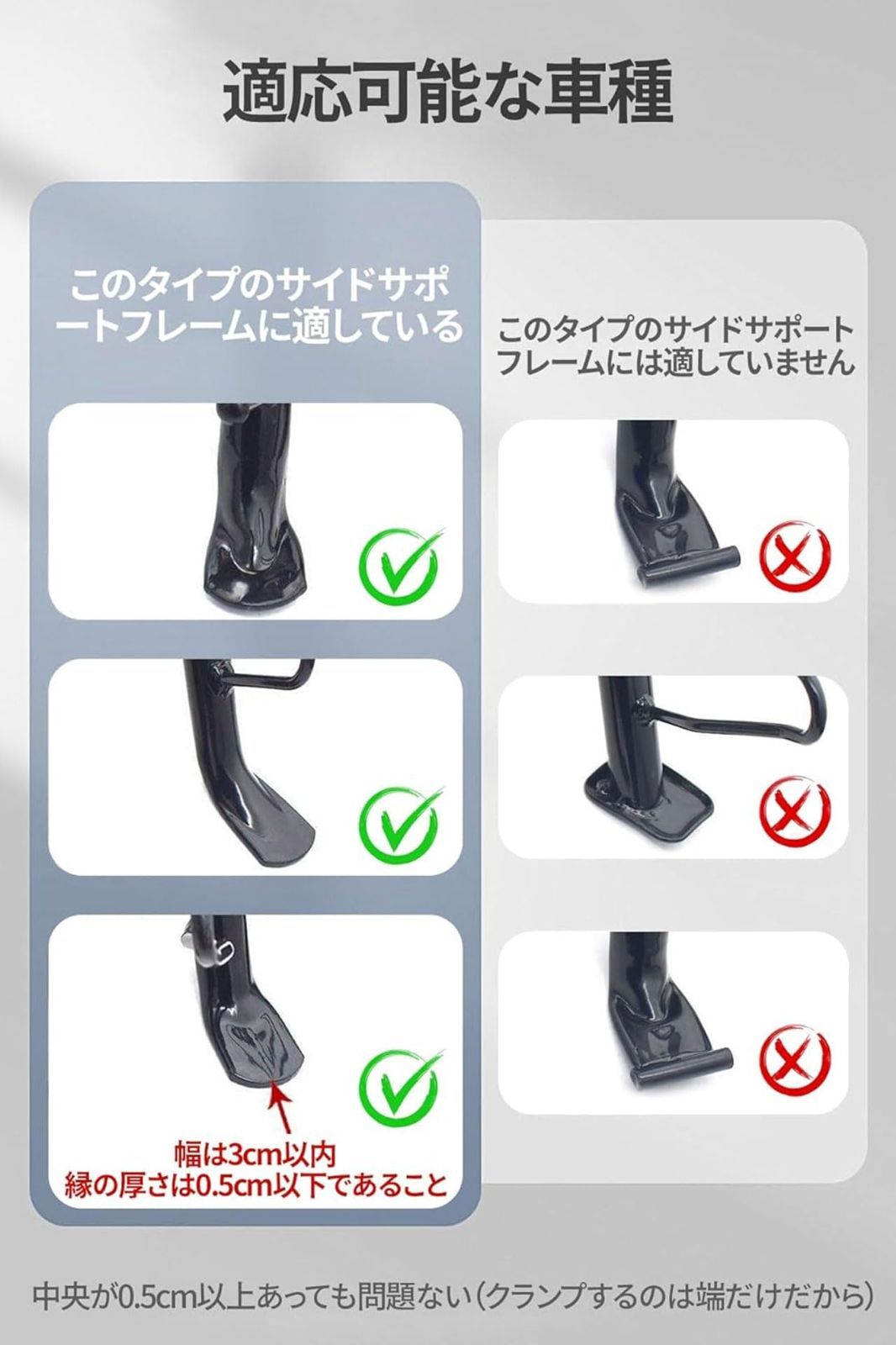 【機能】この大きな足のサポートエクステンションパッド、柔らかい地面、泥の縁、砂、柔らかいアスファルト、不均一な表面でも、自転車は常に安全な足場を持ち、転倒と沈みを防ぐことを心配しません。 オートバイの外観を強化し、拡大器がサイドスタンドフットの面積を増加させて、コストのかかるチップオーバーを防ぐのに役立ちます。