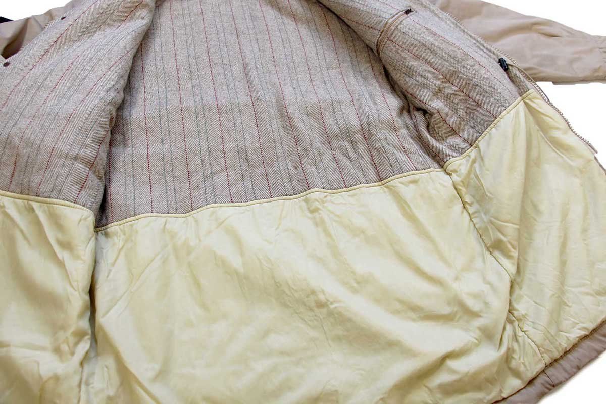 チンストラップ付き、中綿入り、上身頃はランダムストライプのツイードライナー、フロントはYKKダブルジップと刻印入りスナップボタン、ラグランスリーブ、ダブルステッチ襟、縫製はダブルステッチ、ネックリブあり、ウエストにドローコードあり、ハンドウォーマーポケットあり、左内ポケットあり