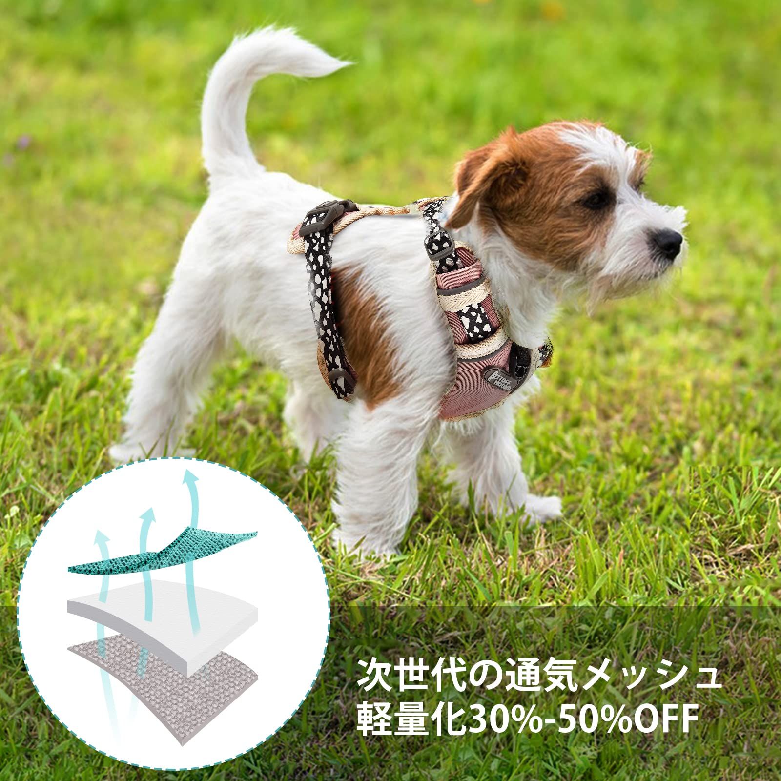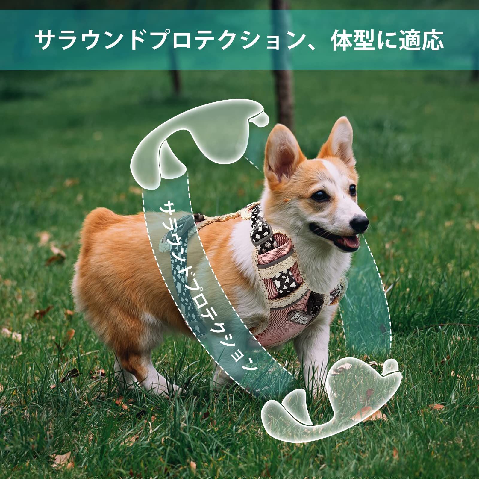 【規格】:XLサイズ: 首回り50-72cm 胴回り73-105cm。犬ハーネス簡単で首周りと胴回りの調整可能です、胴回りにバックルが2つ付いているので、ハーネスの着脱は、足を上げずに簡単に装着できます。ドッグハーネスの内側はメッシュ素材で、肌触りがソフトで、摩擦による痛みはありません、散歩中わんちゃんの体への負担を軽減できます。通気性良い、蒸れずにワンちゃんは快適です、濡れても乾きが早いです、夏でも使用できます。