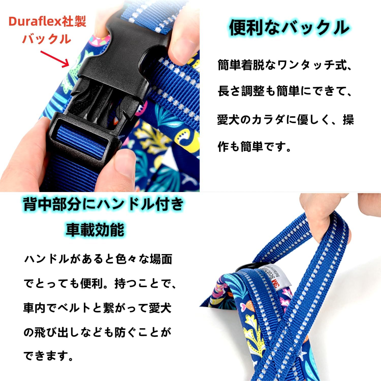 ハンドル部分、車載効能:背中部分にナイロンウェいイビックハンドル素材のハンドルがついたハーネスです。ハンドルを持つと、犬の急な動きに対応でき、犬を制御し易くなります。