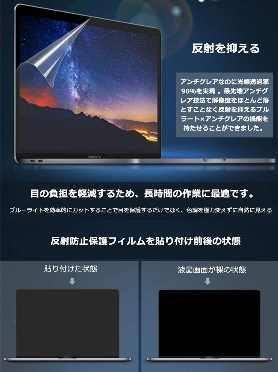 【超反射防止】:眩光防止(アンチグレア)加工により、光の映り込みを軽減し、画面を見やすくします。従来のTPUソフトフィルムよりもクリアで明るい、透過率が高いです。立体感に優れ、長時間で使用しても目が疲れません。