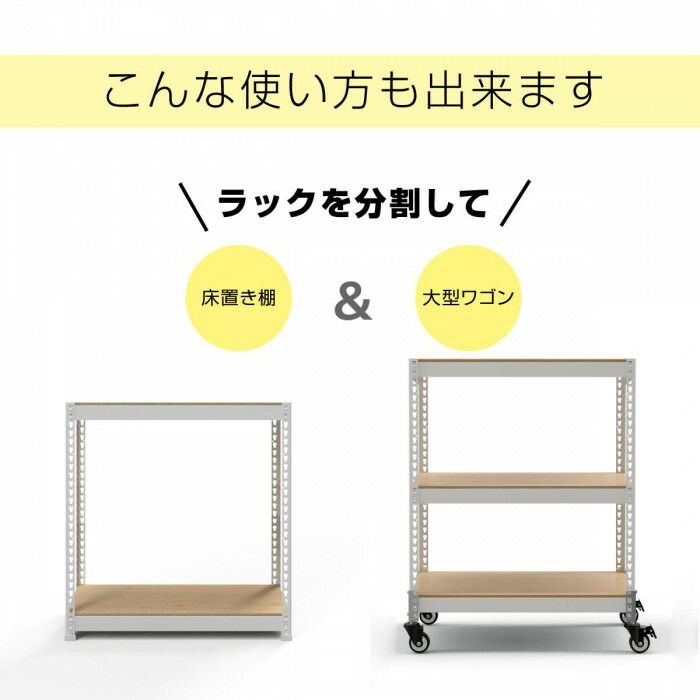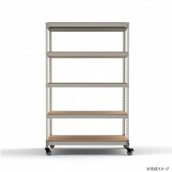 幅121cmのシェルフ5段にキャスターが付いたセットです。キャスター4個付き、うちブレーキキャスターは2個付属。重いラックでもラクラク移動が可能です。
