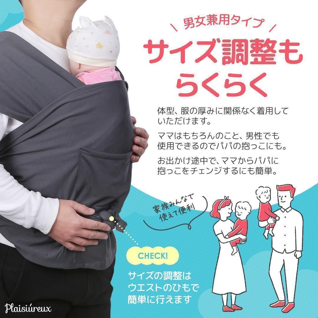 サイズを簡単に調整できるので、体型、服の厚みに関係なく着用いただけます。ママはもちろんのこと、男性でも使用できるのでパパの抱っこにも。お出かけ途中で、ママからパパに抱っこをチェンジすることもできます。