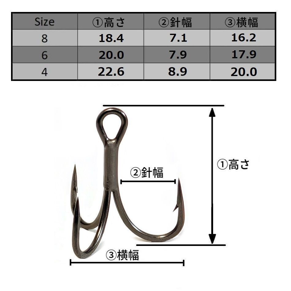 ・チタンコーティングにより滑らかでより高い耐久性と優れたフッキング性能を持つトレブルフックです。