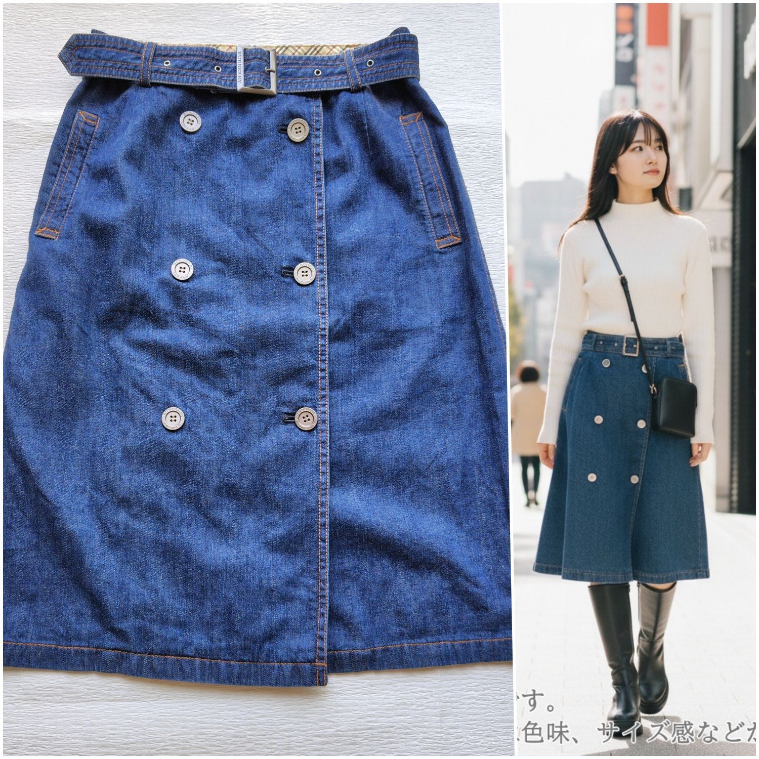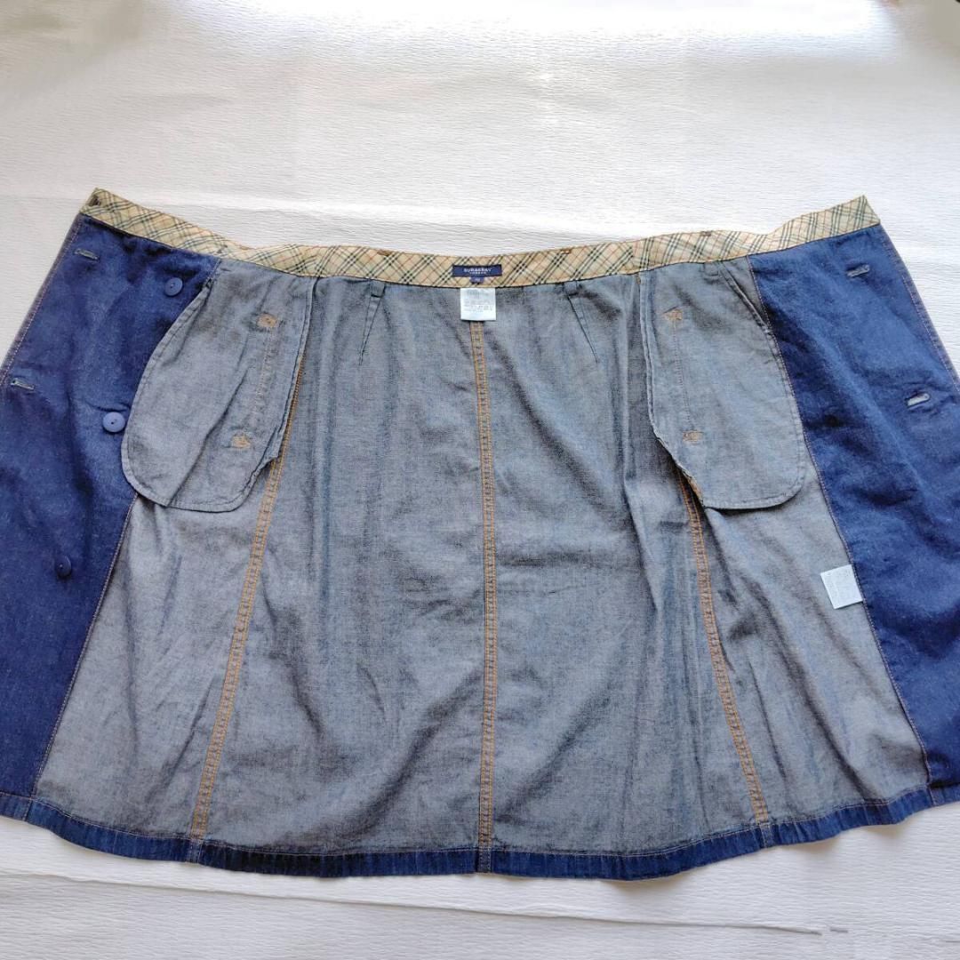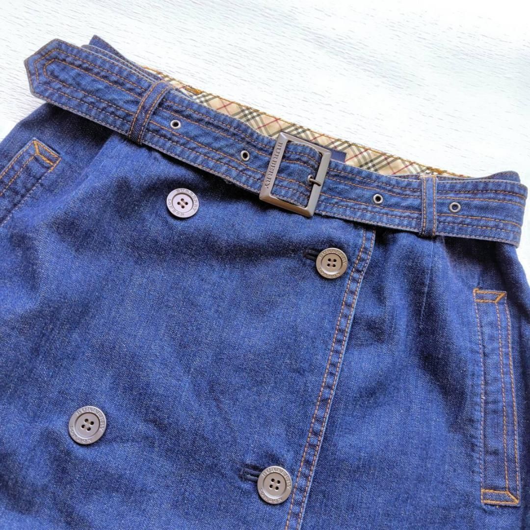 ブランドの象徴であるトレンチコートを、デニムの巻きスカートに再構築した、遊び心あふれるデザインです。フロントに並んだダブルのボタン、がっしりとしたベルトが、着こなしの主役になる存在感を放ちます。そして、ウエストの内側にさりげなく覗くノバチェックが、バーバリーであることの誇りを静かに物語っていますね。