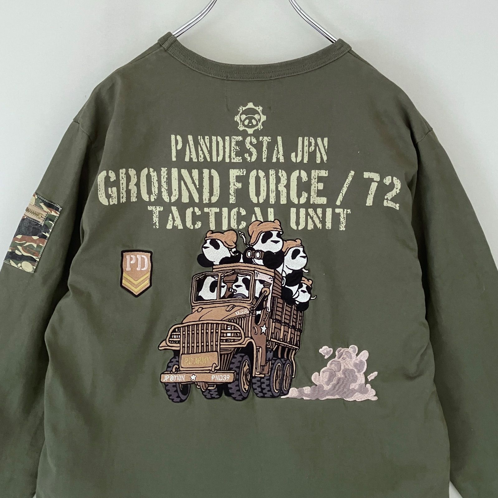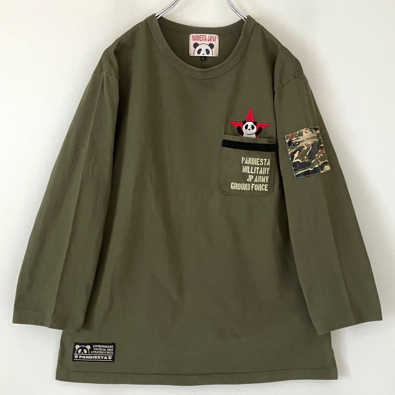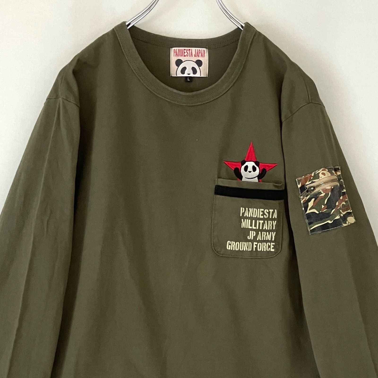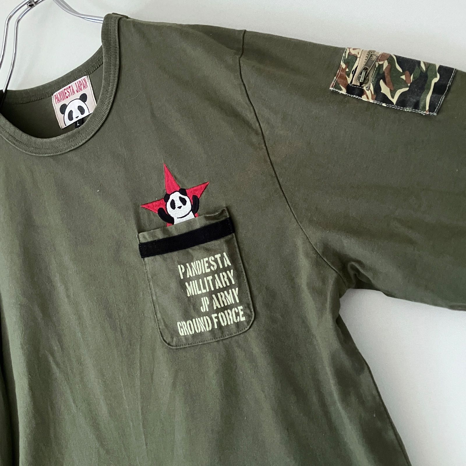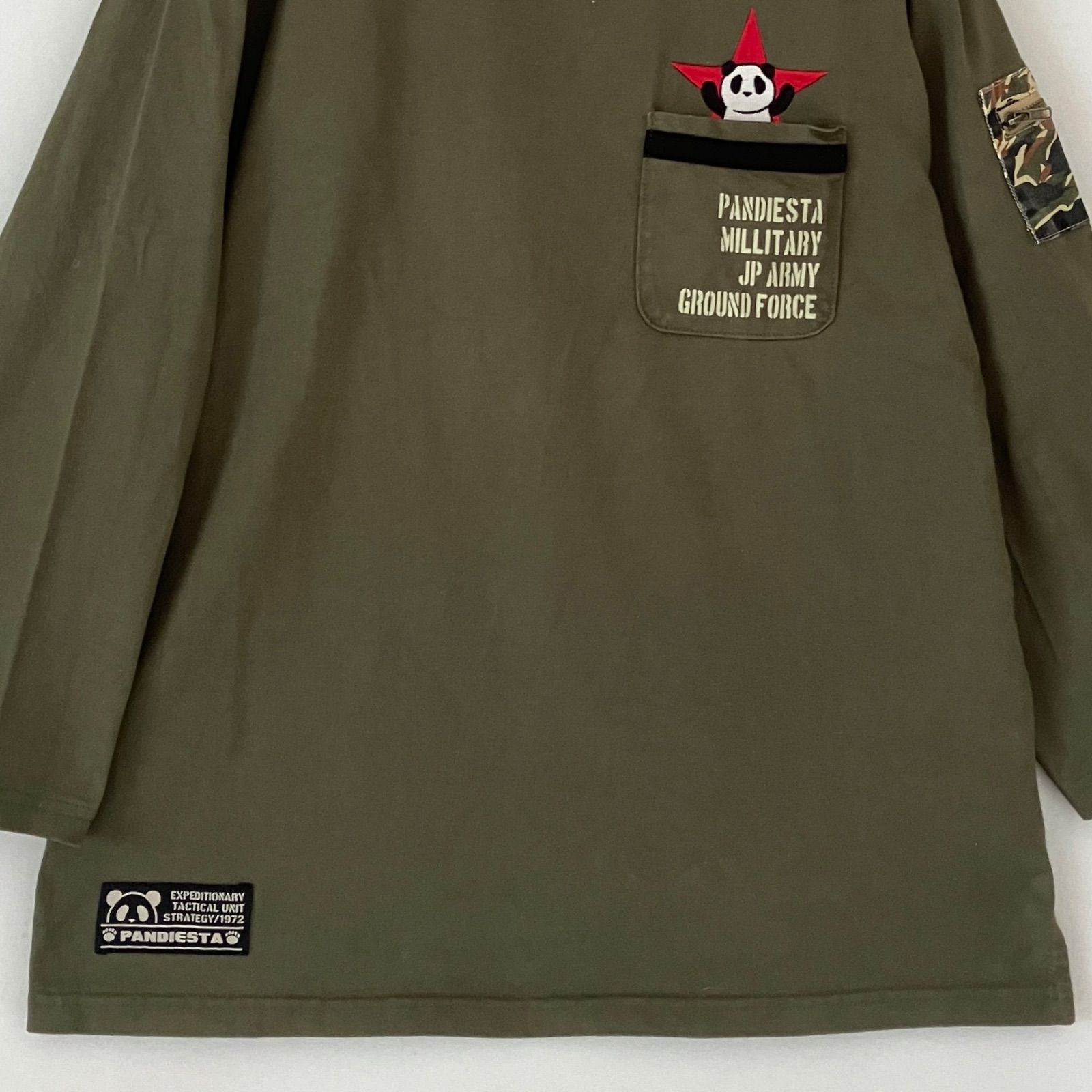 袖にカモフラ柄でミリタリーな感じのポケット付き