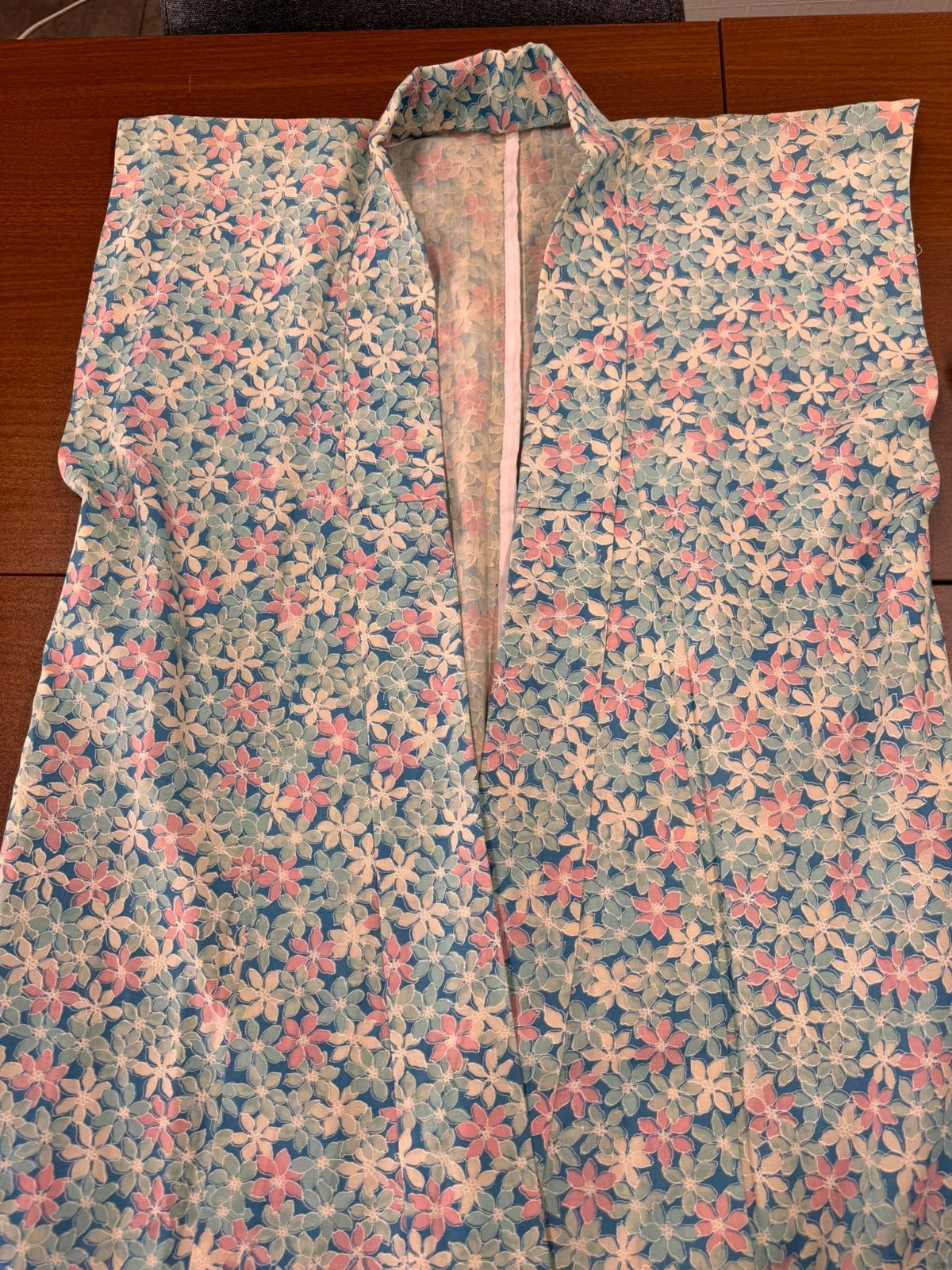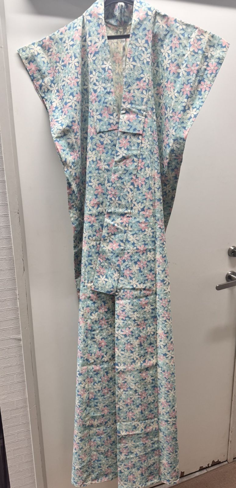 空色の地色に白・ピンク・水色の小花柄がいっぱいに入った袖なしの着物です。