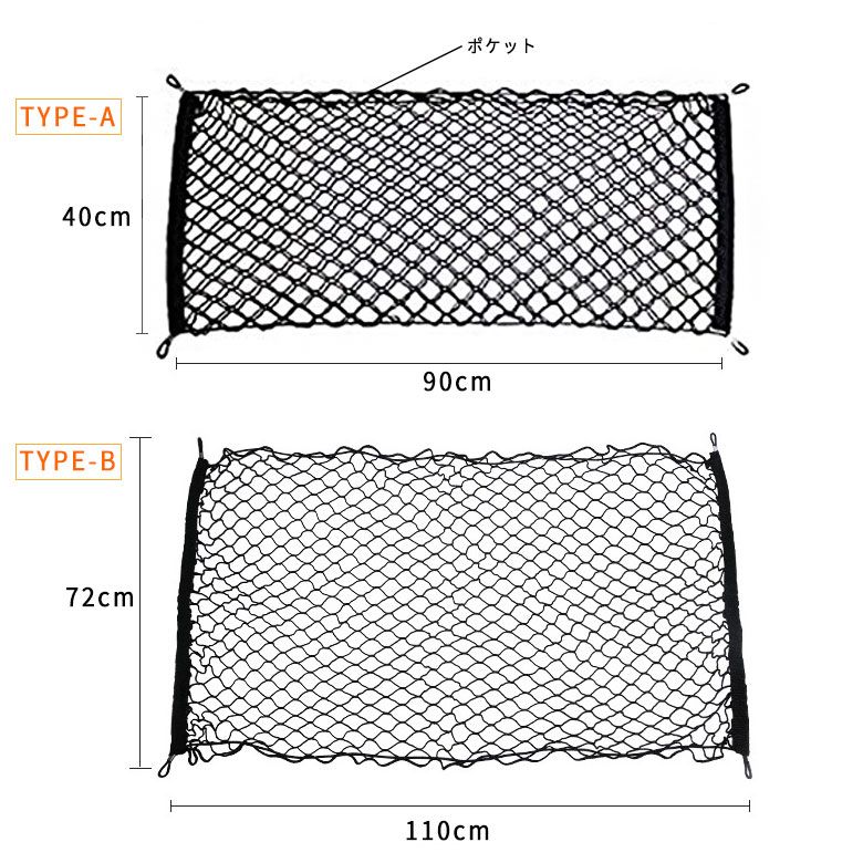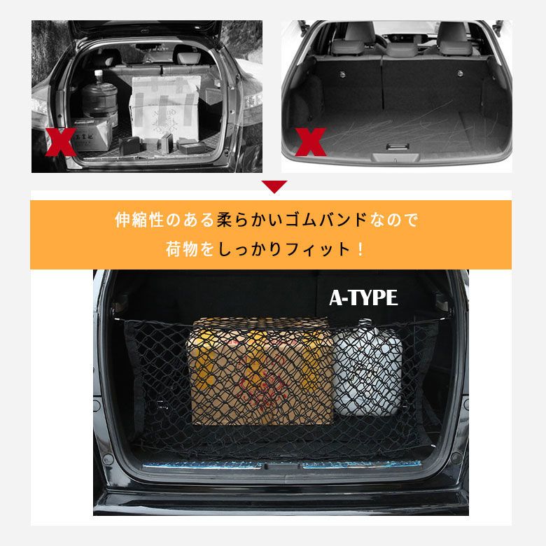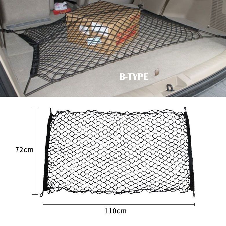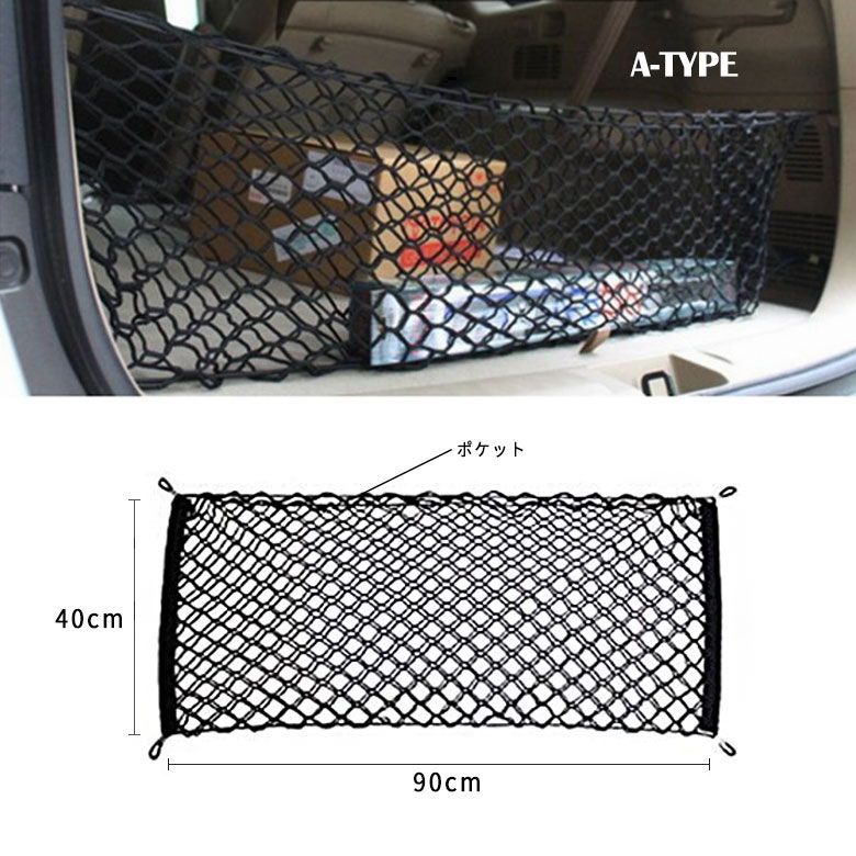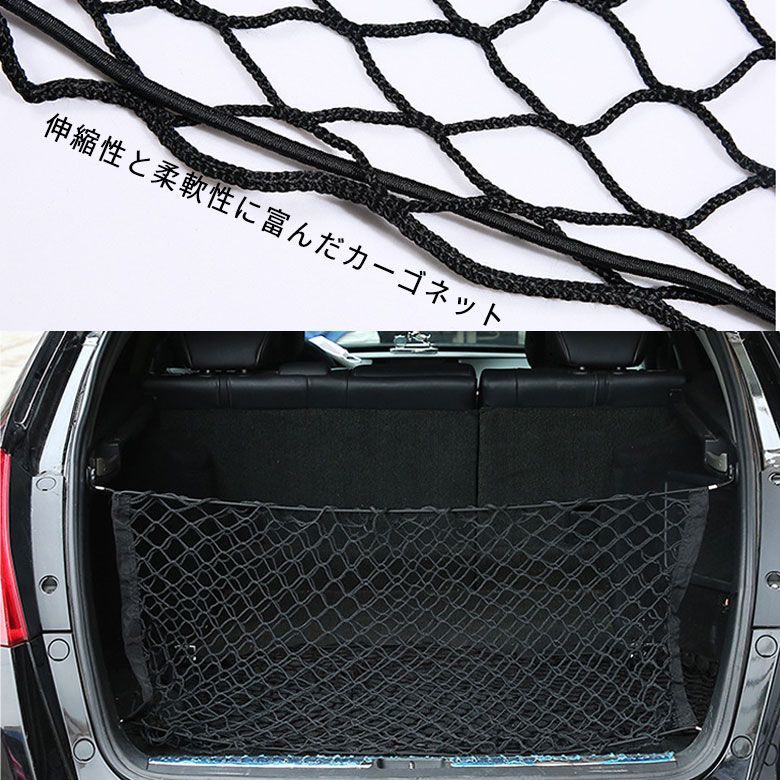 自動車のトランクや荷室の収納、に崩れ防止、荷物固定、整理整頓に便利なトランクネット、カーゴネットです。ゴム製のメッシュネットでスッキリと収納できます。