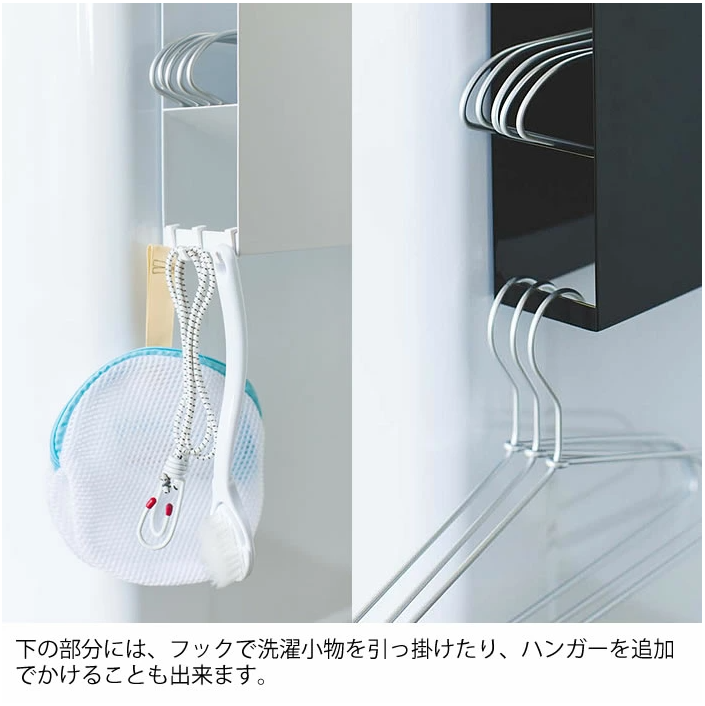 また、下の部分にはハンガーを追加でかけることも出来ますが、フックを使って洗濯小物を引っ掛けることも出来るので、ランドリーまわりをスッキリとすることが出来ます。